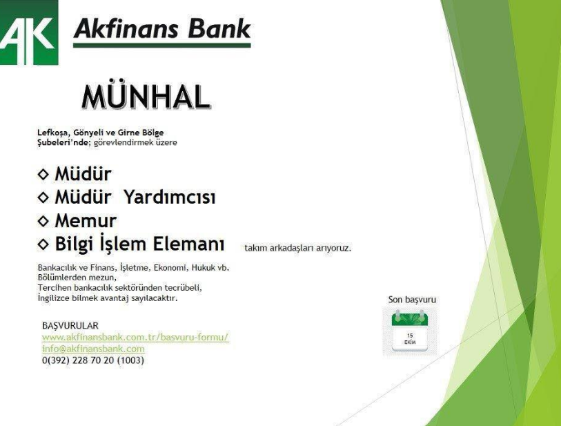 Kuzey Kıbrıs’ta iş arayan veya iş değiştirmek isteyenlerin münhal kaynağı Ekonomi Kıbrıs olarak yeni bir seçenek paylaşıyoruz!Tamamı yerel sermaye ile kurulmuş KKTC’nin önde gelen güvenilir, teknolojik ve ulaşılabilir bankası Akfinans Bank Ltd münhal açtı.-Müdür-Müdür yardımcısı-Bilgi işlem elemanı-Memur