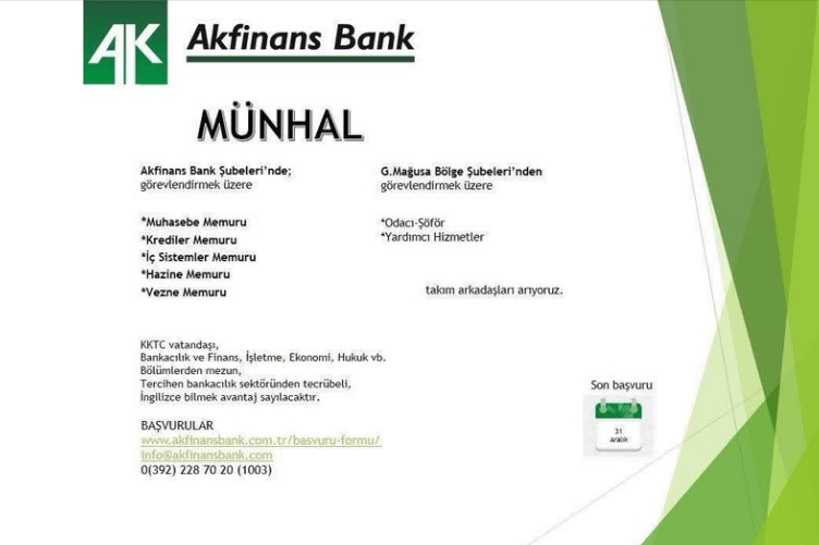 Kuzey Kıbrıs’ta iş arayan veya iş değiştirmek isteyenlerin münhal kaynağı Ekonomi Kıbrıs olarak yeni bir seçenek paylaşıyoruz!Tamamı yerel sermaye ile kurulmuş KKTC’nin önde gelen güvenilir, teknolojik ve ulaşılabilir bankası Akfinans Bank Ltd münhal açtı.-Muhasebe memuru-Krediler memuru-İç sistemler memuru-Hazine memuru-Vezne memuru-Odacı-Şoför-Yardımcı hizmetler