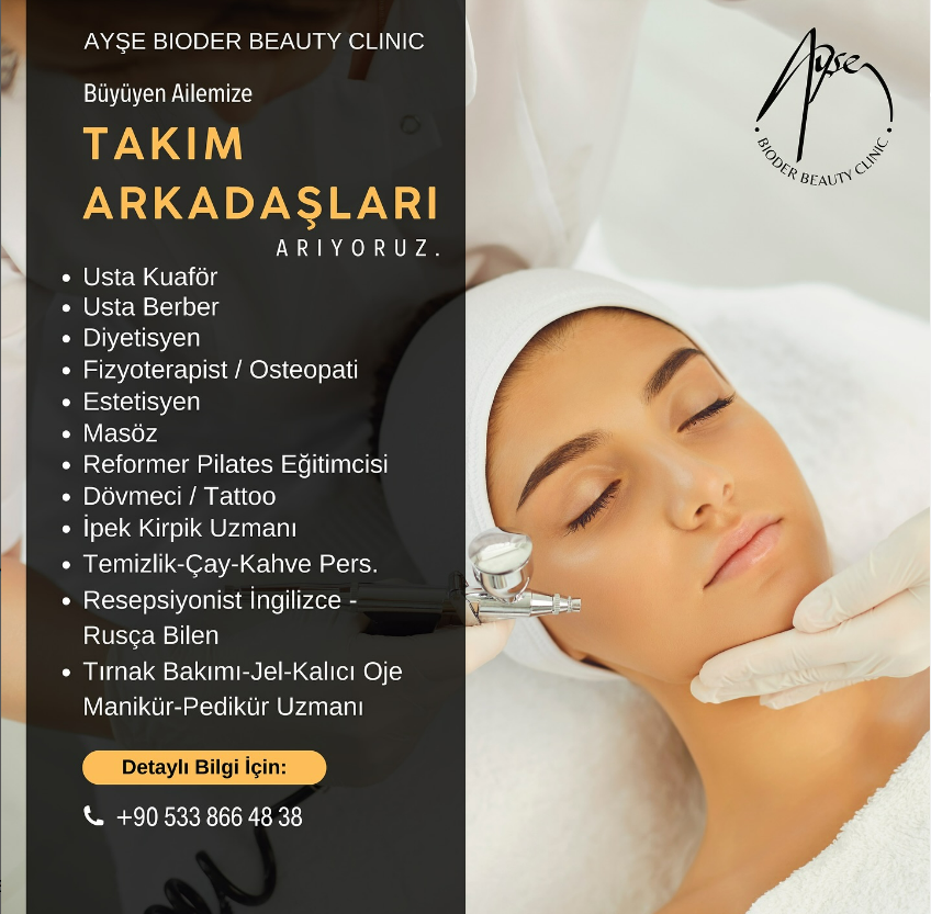 Kuzey Kıbrıs’ta iş arayan veya iş değiştirmek isteyenlerin münhal kaynağı Ekonomi Kıbrıs olarak yeni bir seçenek paylaşıyoruz! Detaylar Ekonomi Kıbrıs'ta.Uzman doktor kadrosuyla, modern, teknolojik ve sağlık alanında birçok ilkler ve yeniliklerle tam donanımlı olarak Kuzey Kıbrıs'ta hizmet veren Ayşe Bioder Beauty Clinic 14 pozisyon için münhal açtı.Detaylaı bilgi: 05338664838