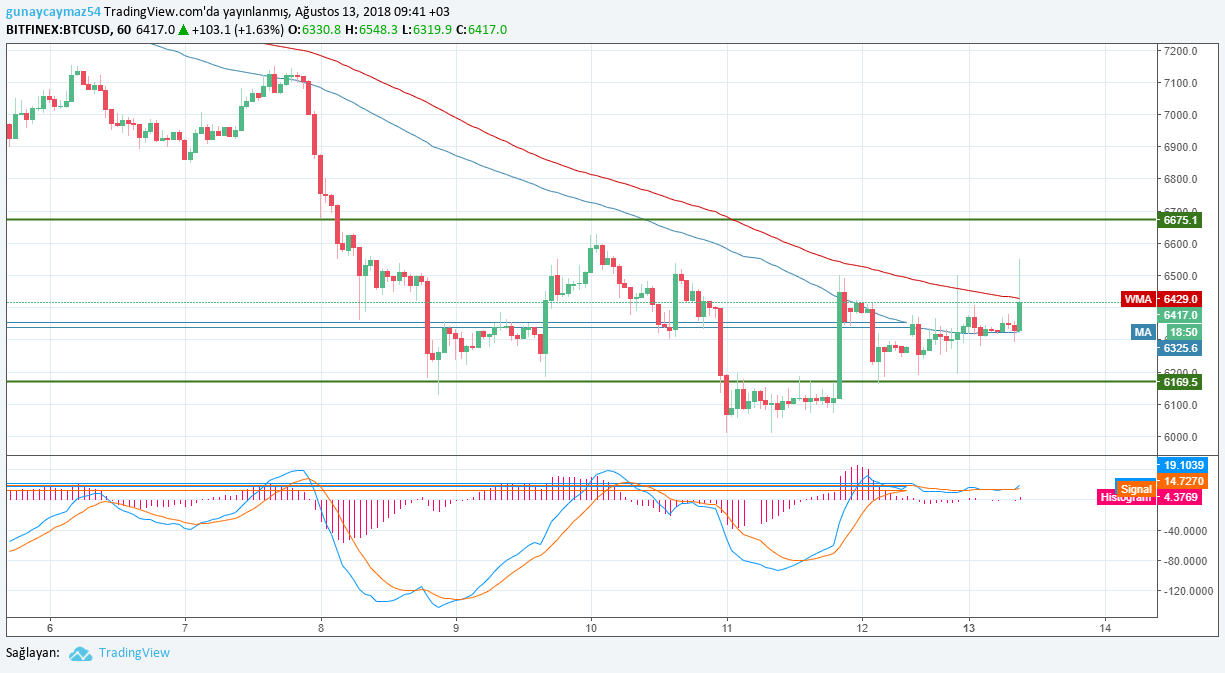 Sabah seansı hareketlerinde ise yeniden pozitif görünümde hareket eden Bitcoin, yazımızın yayına hazırlandığı sabah saatlerinde 6.500 doların üzerine çıkmak için mücadele ediyor. Şu an ki görünümde ise fiyat saatlik grafikte 100 HO’yu kendine destek yapmış durumda ve 6.430 dolarda seyreden 200 HO’yu kendine dinamikli direnç yapmış durumda.