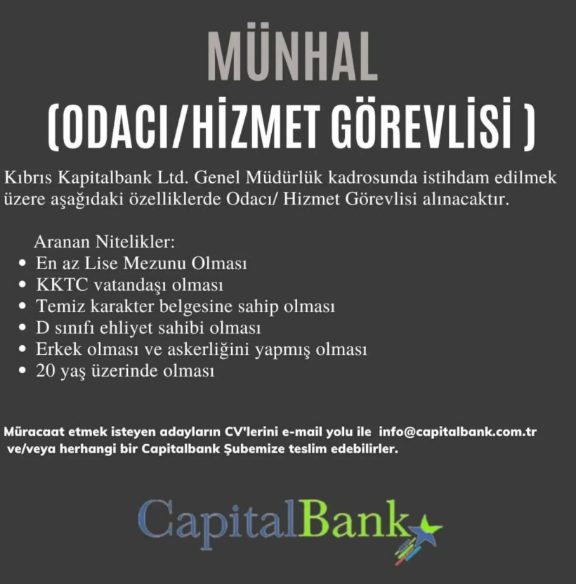 Kuzey Kıbrıs’ta iş arayan veya iş değiştirmek isteyenlerin münhal kaynağı Ekonomi Kıbrıs olarak yeni bir seçenek paylaşıyoruz.KKTC'nin sayılı kurumsal firmalarından Capitalbank Kıbrıs bünyesinde istihdam etmek üzere yeni takım arkadaşları aramaktadır.-Odacı/Hizmet görevlisiBaşvuru : [email protected]