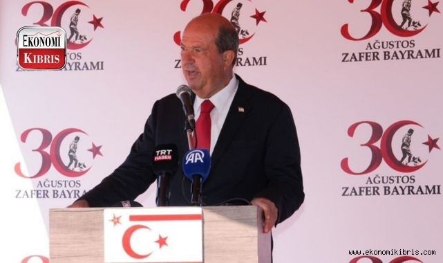 Cumhurbaşkanı Ersin Tatar törende yaptığı konuşmada, kıbrıs Türk halkının, Anavatan Türkiye Cumhuriyeti’nden aldığı ilhamla, vatana, millete yakışır şekilde onurunu kimsenin ayakları altında çiğnetmeden Kıbrıs’taki varlık mücadelesini bugünlere kadar getirdiğini belirtti. Tatar, Kıbrıs Türk halkı için Anavatan Türkiye Cumhuriyeti’nin garantörlüğü ve Türk askerinin caydırıcı güç olarak Kıbrıs’taki varlığının yaşamsal öneme sahip olduğunu vurguladı.Törene Cumhurbaşkanı Ersin Tatar, Cumhuriyet Meclisi Başkanı Zorlu Töre, Başbakan Ünal Üstel, Yüksek Mahkeme Başkanı Bertan Özerdağ, 2’nci Cumhurbaşkanı Mehmet Ali Talat, 3’üncü Cumhurbaşkanı Derviş Eroğlu, TC Lefkoşa Büyükelçisi Yasin Ekrem Serim, Kıbrıs Türk Barış Kuvvetleri Komutanı Tümgeneral Sebahattin Kılınç, Güvenlik Kuvvetleri Komutanı Tümgeneral İlker Görgülü, Ana Muhalefet Cumhuriyetçi Türk Partisi Genel Başkanı Tufan Erhürman, bakanlar, bazı milletvekilleri, askeri erkan, diğer yetkililer ve vatandaşlar katıldı.Tören, İstiklal Marşı ile bayrakların göndere çekilmesi, tören birliklerinin denetlenmesi ve halkın bayramının kutlanmasıyla başladı.Törende, Cumhurbaşkanı Ersin Tatar ve Kıbrıs Türk Barış Kuvvetleri Komutanlığı adına Piyade Üsteğmen Ali Rıza Yılmaz konuşma yaptı. Tören resmigeçit ile sona erdi.Cumhurbaşkanı Tatar: “Kıbrıs Türk halkına ilham kaynağı oldu”Cumhurbaşkanı Ersin Tatar törende yaptığı konuşmada, Büyük Önder Mustafa Kemal Atatürk’ün, Çanakkale Savaşlarından sonra Kurtuluş Savaşı yoluna çıktığını ifade ederek, Atatürk’ün 19 Mayıs’ta Samsun’a çıkışı, Sakarya Meydan Muharebesi ve Büyük Taarruz’un ardından 30 Ağustos’ta Büyük Zaferinin kazanıldığını söyledi.Tatar, 30 Ağustos Zafer Bayramı’nın 102’nci yıl dönümünde, büyük bir milletin küllerinden nasıl doğabileceğine, Büyük Önder Mustafa Kemal Atatürk ve silah arkadaşlarının kahramanlıklarına vurgu yaptı.Türk milletinin işgal kuvvetlerinden kurtulduğunu ve Türkiye Cumhuriyeti’nin kurulduğunu ifade eden Cumhurbaşkanı Tatar, asla başkalarının esareti altında yaşanmayacağını, milletin bağımsızlığı, hürriyeti ve onurlu yaşamanın esas olduğunu vurguladı. Cumhurbaşkanı Tatar, bütün bu başarı ve kazanımların, diğer mazlum milletler gibi Kıbrıs Türk halkına da ilham kaynağı olduğunun altını çizdi.Malazgirt Savaşı ve 500 yıl sonra 1 Ağustos 1571’deki Kıbrıs’ın fethine değinen Cumhurbaşkanı Tatar, Kıbrıs’ta İngiliz Sömürge Dönemi'ndeki zor yıllarda, Kıbrıs Türk halkını yok etmek için yapılan her türlü saldırı ve mezalime karşı Türk milletine yakışır bir mücadele verildiğini söyledi.“Biz de anavatandan aldığımız ilhamla burada bağımsızlığımızı ve hürriyetimizi kazanmaya çalışıyorduk” diyen Cumhurbaşkanı Tatar, bu uğurda şehitler verildiğini, göç edildiğini, her türlü saldırıya karşı direniş gösterildiğini kaydetti. Cumhurbaşkanı Tatar, “Vatanımıza, milletimize yakışır şekilde onurumuzu kimsenin ayakları altında çiğnetmeden buradaki varlık mücadelemizi bugünlere kadar getirmenin mutluluğu içerisindeyiz” diye konuştu.“Türkiye Cumhuriyeti’nin garantörlüğü ve Türk askerinin caydırıcı güç olarak Kıbrıs’taki varlığı yaşamsal öneme sahip”Kıbrıs Barış Harekatı’nın 50’nci yıl dönümünün büyük bir coşkuyla kutlandığına işaret eden Cumhurbaşkanı Tatar, anavatana duydukları güveni bir kez daha ifade ettiklerini söyledi. Türkiye Cumhuriyeti Cumhurbaşkanı Recep Tayyip Erdoğan’ın, “Kıbrıs’ta federal temelde bir anlaşmanın artık geride kaldığı ve bundan sonraki süreçte iki devletli bir çözümün mutlak olduğu” söylemine dikkat çeken Cumhurbaşkanı Tatar, Kıbrıs Türk halkı için de Anavatan Türkiye Cumhuriyeti’nin garantörlüğü ve Türk askerinin caydırıcı güç olarak Kıbrıs’taki varlığının yaşamsal öneme sahip olduğunu vurguladı.Kıbrıs Türk halkının, büyük Türk milletinin ayrılmaz ve kopmaz bir parçası olduğunu belirten Cumhurbaşkanı Tatar, Mavi Vatan’da, Anavatan Türkiye Cumhuriyeti ile birlikte ‘anavatan, yavru vatan, Mavi Vatan’ anlayışıyla ulusal çıkar ve menfaatlerin korunmasının önemini belirtti.Büyük Önder Mustafa Kemal Atatürk, silah arkadaşları ve şehitleri rahmet ve özlemle anan Cumhurbaşkanı Tatar, Türk Silahlı Kuvvetleri, Kıbrıs Türk Barış Kuvvetleri, Güvenlik Kuvvetleri Komutanlığı ve gazilere şükranlarını sundu.Cumhurbaşkanı Tatar, 30 Ağustos Zafer Bayramı’nı kutlayarak, konuşmasını tamamladı.
