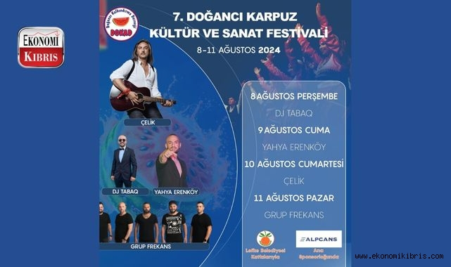 Dernek’ten verilen bilgiye göre, 7’ncisi yapılacak festival, Doğancı Kalkındırma Derneği (DOKAD) ev sahipliğinde, Lefke Belediyesi’nin katkıları, Doğancı Kooperatif Kredi Şti’nin destekleri ve Alpcans ana sponsorlunda 8-11 Ağustos tarihleri arasında gerçekleştirilecek.Saat 18.30’da kortejle başlayacak festivalin açılısında sırasıyla Lefke Belediye Başkanı Aziz Kaya, Başbakan Yardımcısı, Turizm, Kültür, Gençlik ve Çevre Bakanı Fikri Ataoğlu ile Cumhurbaşkanı Ersin Tatar birer konuşma yapacak.Festival boyunca misafirlere ücretsiz tadımlık karpuz dağıtımı yapılacak, ayrıca “para ile değil doya doya çocuklarımız eğlensin” sloganı ile sponsorlar tarafından finanse edilen oyun alanları hizmet verecek.Kurulacak stantlarda bölge ve ülke kültürünü temsil eden yiyecek, içecek, el işi, hediyelik eşya gibi ürünler satılacak, ayrıca halk dansları, jönglör gösterisi, Kafkas dansı, led ışıklı dans şov, sihirbaz gösterileri ve benzeri etkinlikler izleyicilerin beğenisine sunulacak.