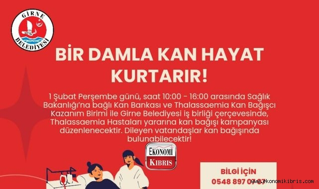 Kan bağış kampanyası “Bir damla kan hayat kurtarır” sloganıyla 10.00-16.00 saatleri arasında Girne Belediyesi Yeni Hizmet Binası’nda gerçekleşecek.