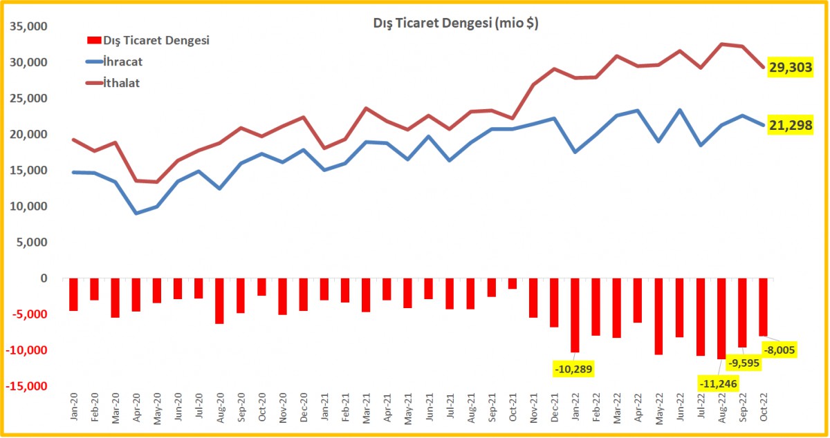 - Küresel mali piyasalar dün FED toplantısı öncesinde günün büyük bölümünü sakin bir seyirle geçirirken, Sn. Cumhurbaşkanı Erdoğan'ın Ukrayna tahıl sevkiyatinin saat 12'den sonra planlandığı gibi devam edeceğini söylemesi ve Rusya'nın anlaşmaya geri dönmesi ile buğday vadeli kontratları sert bir şekilde (%6 civarı) gerileyerek 8,4 usd/bushel seviyesine geri çekildi. Dün Avrupa'da açıklanan imalat PMI verileri beklentileri karşılayamazken, her ayın ilk cuması ABD'de açıklanan resmî istihdam verisi öncesinde takip ettiğimiz ADP özel sektör istihdamı Ekim ayında 239bin kişi ile 195bin olan beklentinin çok üzerinde artış kaydetti (istihdam verileri ABD ekonomisinin güçlü olduğuna işaret etmeye devam ediyor). Türkiye'de ise öncü dış ticaret verilerine göre dış ticaret açığı yılın ilk 10 ayında %430 artışla 8 milyar dolar oldu (detayları aşağıda grafikten görebilirsiniz).