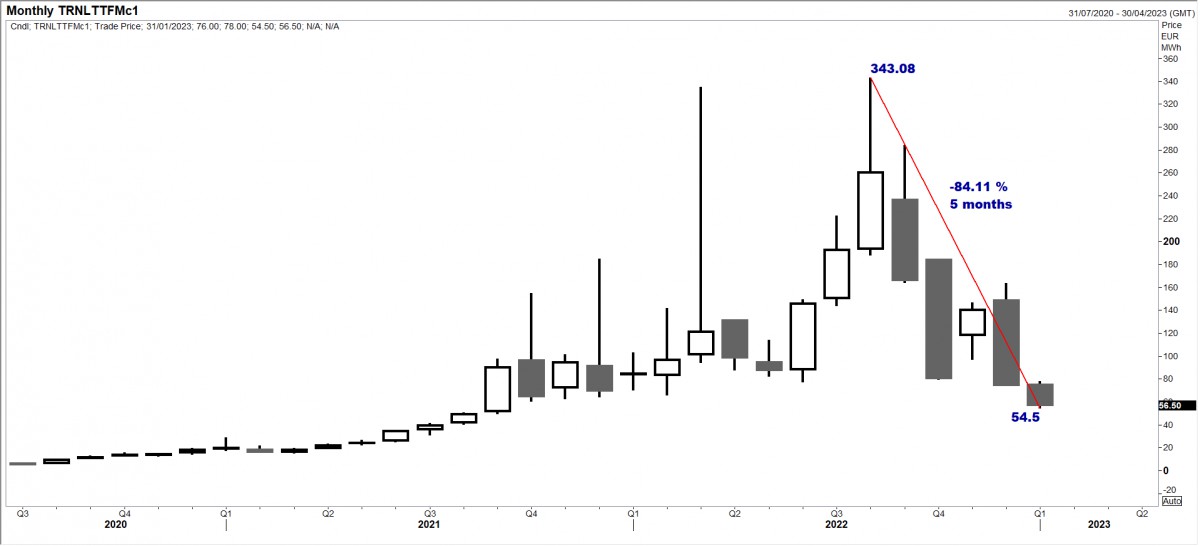 - Hazır iklim krizi ve global ısınmadan söz etmişken, Avrupa'da referans gaz fiyatları resmen çakıldığının da altını çizlelim. Bunun da arkasında elbette hava koşullarının ılıman olması ana neden olarak yatarken, Ukrayna savaşı nedeniyle pek çok ülkenin yüksek stok tercihi de fiyatlar üzerinde baskı kurdu. Şubat vadeli (1 sonraki ay) TTF 54,5 Euro/MWh seviyesine kadar gerileyerek tepe seviyeden %84 düşüş kaydetti. Gaz fiyatlarında indirim gelme ihtimali göz ardı edilmemelidir.