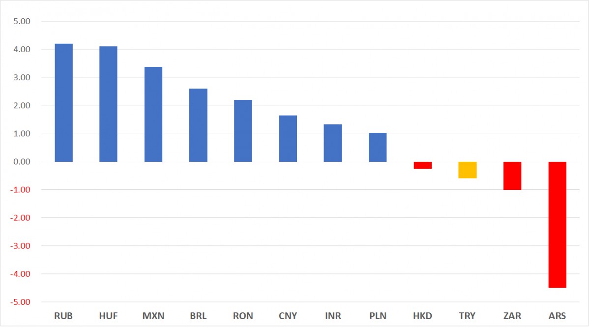 - USDTRY kurunun sakin ve göreceli yatay seyrine sevinirken, Arjantin Pezosu hariç gelişmekte olan ülke para birimlerinin 2023 yılına oldukça iyimser başladıklarını not etmek gerekiyor. Hatta hesaplamayı Ekim 2022 ayından bu yana alırsak %15-20 seviyesine varan değer kazanımları da görüyoruz. Gelişmekte olan ülke para birimlerine yönelik beklentiler, gelişmiş ekonomilere göre iyimser tarafta kümeleniyor. Mesela Hindistan ekonomisine yönelik iyimser beklentiler ön plana çıkarken; Türkiye cephesinde TL'nin reel olarak değerli kalması sanayici ve ihracatçıyı zorluyor.