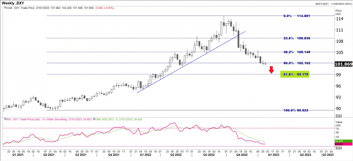 DXYDoların piyasa kuru olan sepet DXY'nin (EUR'nun yükselişine paralel) 102 seviyesindeki prangalarından kurtularak aşağıda 99 seviyesini hedeflediğini düşünüyoruz.