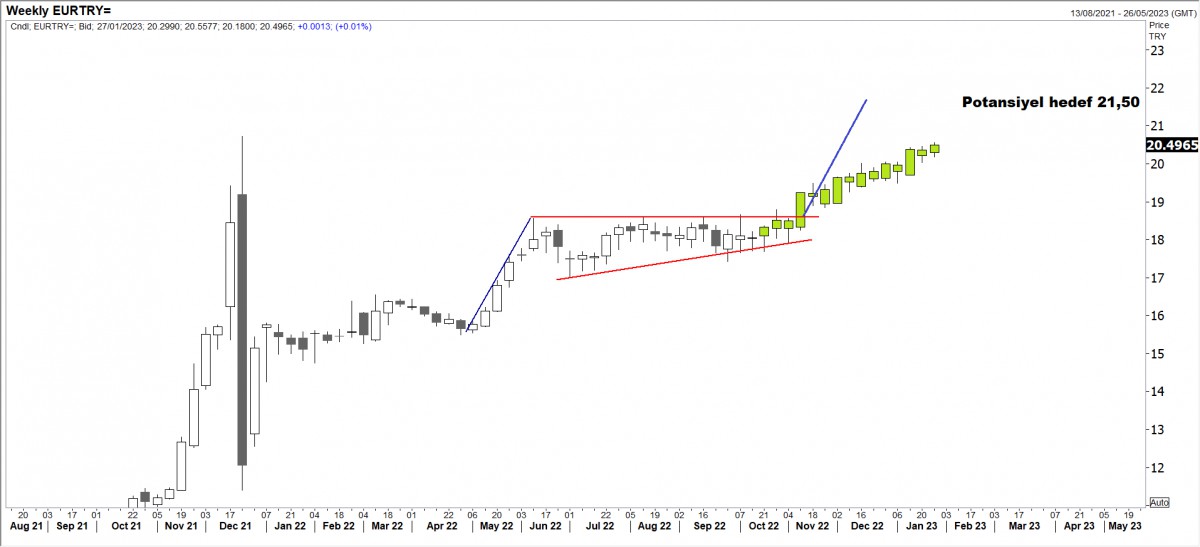 - EUR'nun dolar karşısında anlamlı bir yükseliş içinde olması öte yandan USDTRY kurunun yavaş ama devamlı bir şekilde yükselişine paralel okurlarımızı aylar öncesinden EURTRY kuruna dikkat etmeleri noktasında uyarmıştık. Teknik bir bakış açısıyla 15 haftadir kesintisiz bir şekilde yükselen EURTRY kurunda 21,50 seviyesi radar menzilinde görünüyor.