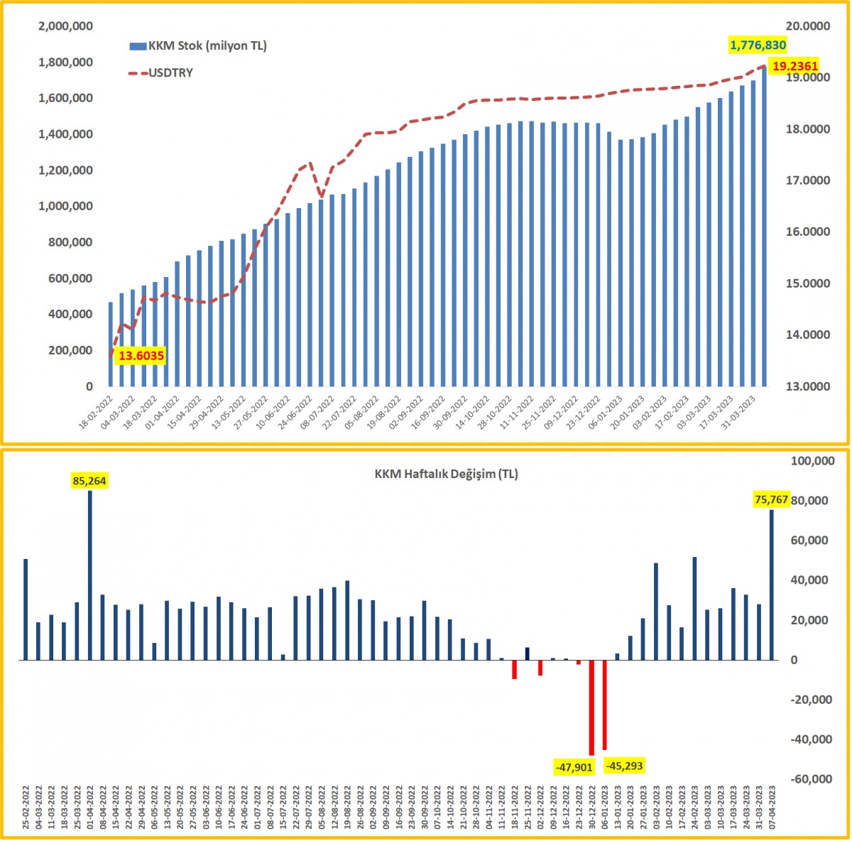 7 Nisan ile biten haftada ~ 76 milyar TL daha artarak 1,78 trilyon TL seviyesine yükselerek rekor kırdı. KKM'de artış son 13 haftada ~ 19,3 milyar dolar oldu. KKM'de tavan faizinin kalkması ile talebinin hız kazandığını görüyoruz.