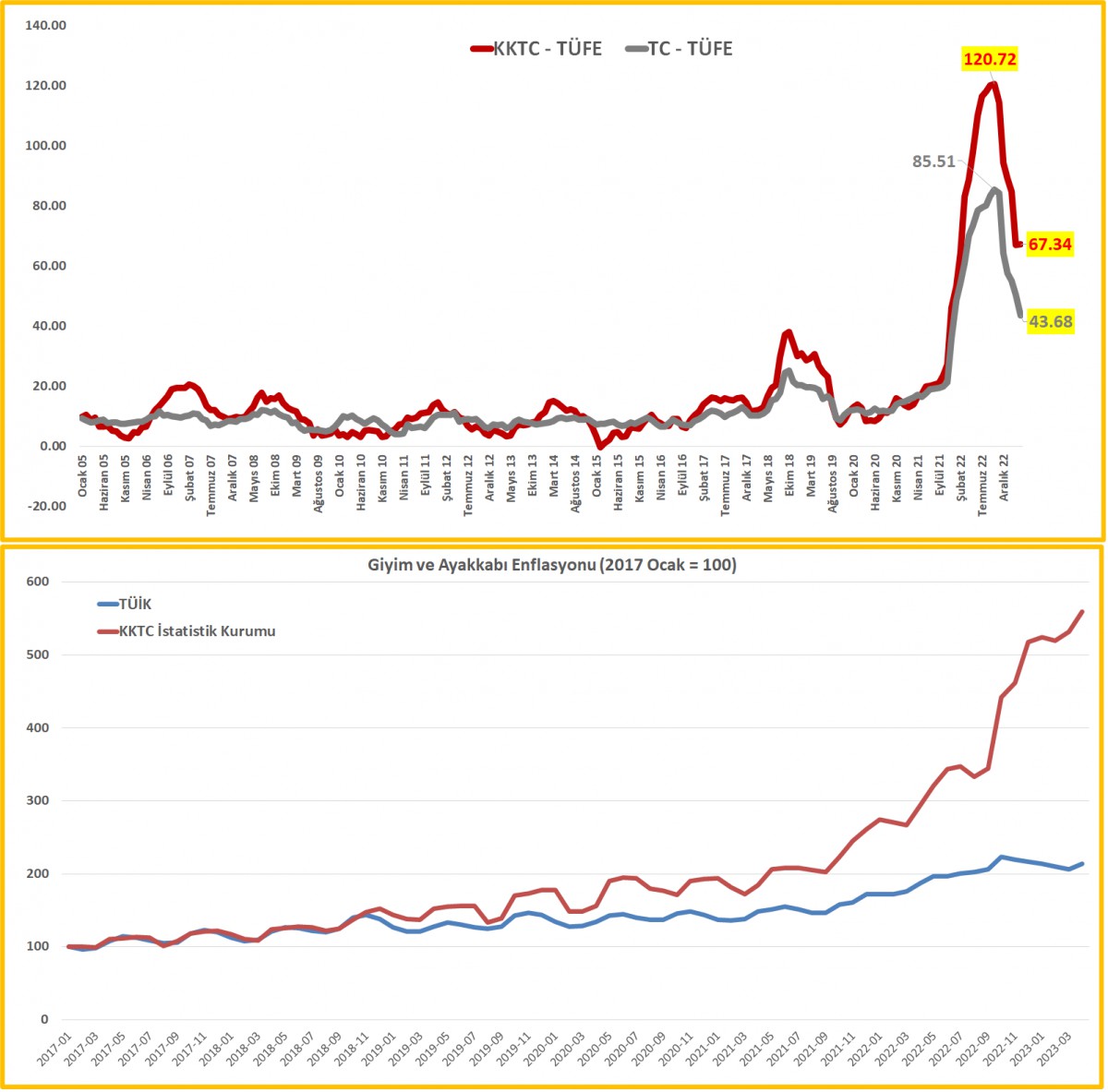 KKTC İstatistik Kurumu verilerine göre, Nisan ayında TÜFE enflasyonu %5,30 artış kaydederken, yıllık manşet enflasyonu %67,34 seviyesine taşıdı. Ekim ayında enflasyonun %120 seviyesini aşması ardından 5 aydır baz etkisi ile gerileyen enflasyon, Nisan ayında hafif de olsa yükseldi (Mart %66,97). Enflasyonun döviz kurunun seyrine paralel yeniden yükselişe geçmesi veya yapışkanlık arz etmesi göz ardı edilmemelidir.
