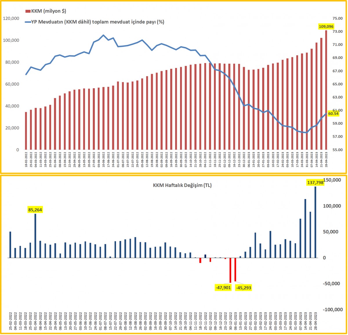 - Cuma günü BDDK tarafından açıklanan 28 Nisan tarihli verilere göre KKM hacmi yükselişini sürdürerek 2,1 trilyon TL seviyesini aştı (yaklaşık olarak 109 milyar dolar). KKM'de üst faiz bandının kaldırılması sonrasında KKM'ye olan talebin artacağını pek çok kez bültenimizde paylaşmıştık. Bu noktada, bankacılık sektörünün toplam mevduatının %20'sinin KKM olduğunu da not etmek gerekiyor. KKM'nin bir nevi yabancı para enstrümanı olduğu ve seçimler sonrasında güven ortamı tam olarak tesis edilmezse, devasa bir büyüklüğü ulaşan KKM'nini beraberinde büyük bir 'gürültü' kopartabileceği göz ardı edilmemelidir. Kurda kayda değer bir yükselişin Hazine'ye getireceği (kur koruması) yükün çok ağır olabileceği gibi, vadesi dolan KKM'nin dövize yönelmesi durumunda sistemin böyle bir talebi karşılama kabiliyetinin de olmadığını not edelim!