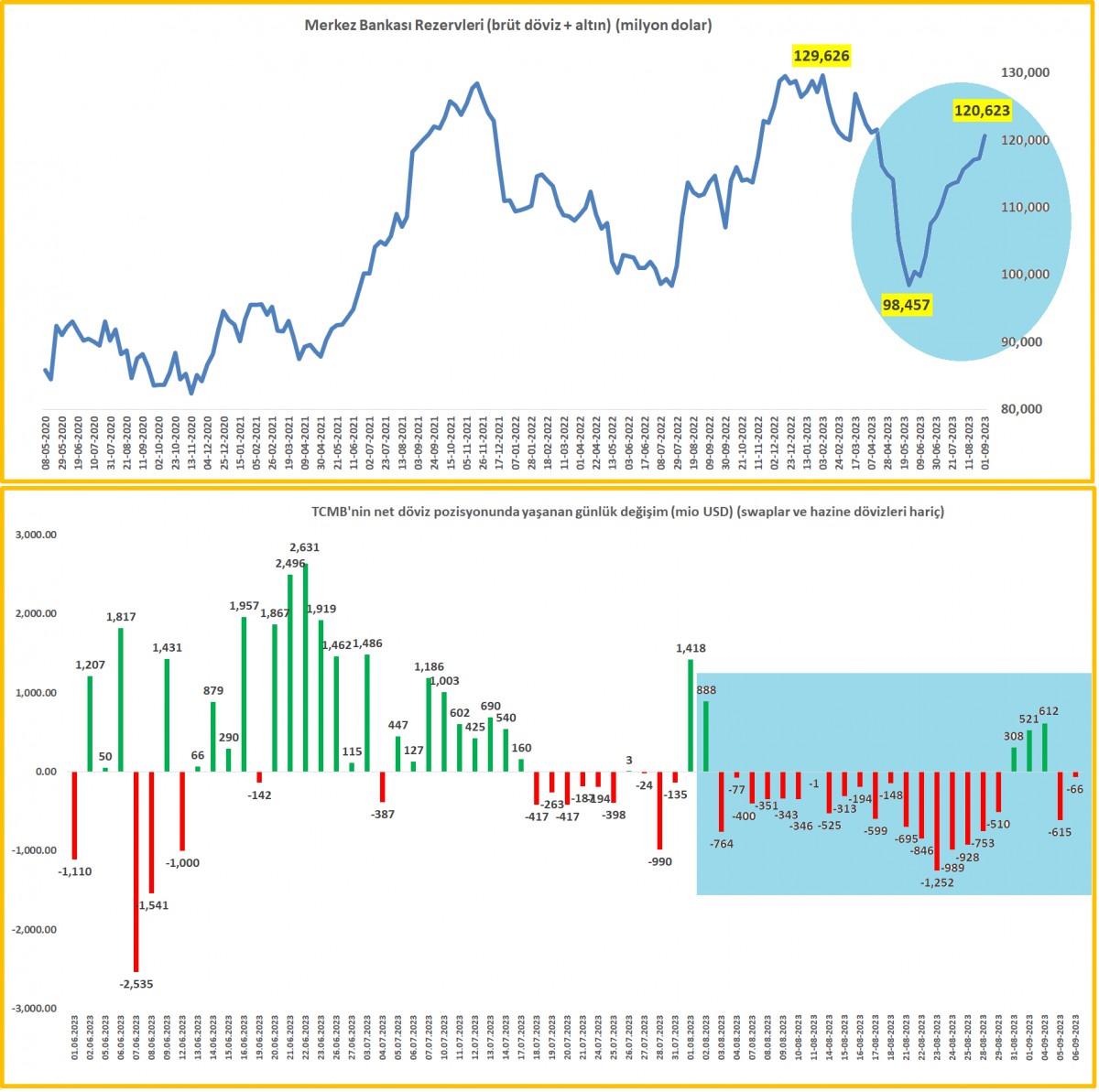 1 Eylül ile biten haftada, TCMB'nin brüt döviz rezervleri 2,8 milyar dolar, altın rezervleri ise 0,5 milyar dolar artış kaydetti. Böylelikle toplam brüt döviz ve altın rezervleri 120,6 milyar dolar seviyesine yükselirken, swap ve hazine dövizleri düşüldükten sonra net pozisyonda böyle bir iyileşme göremedik.