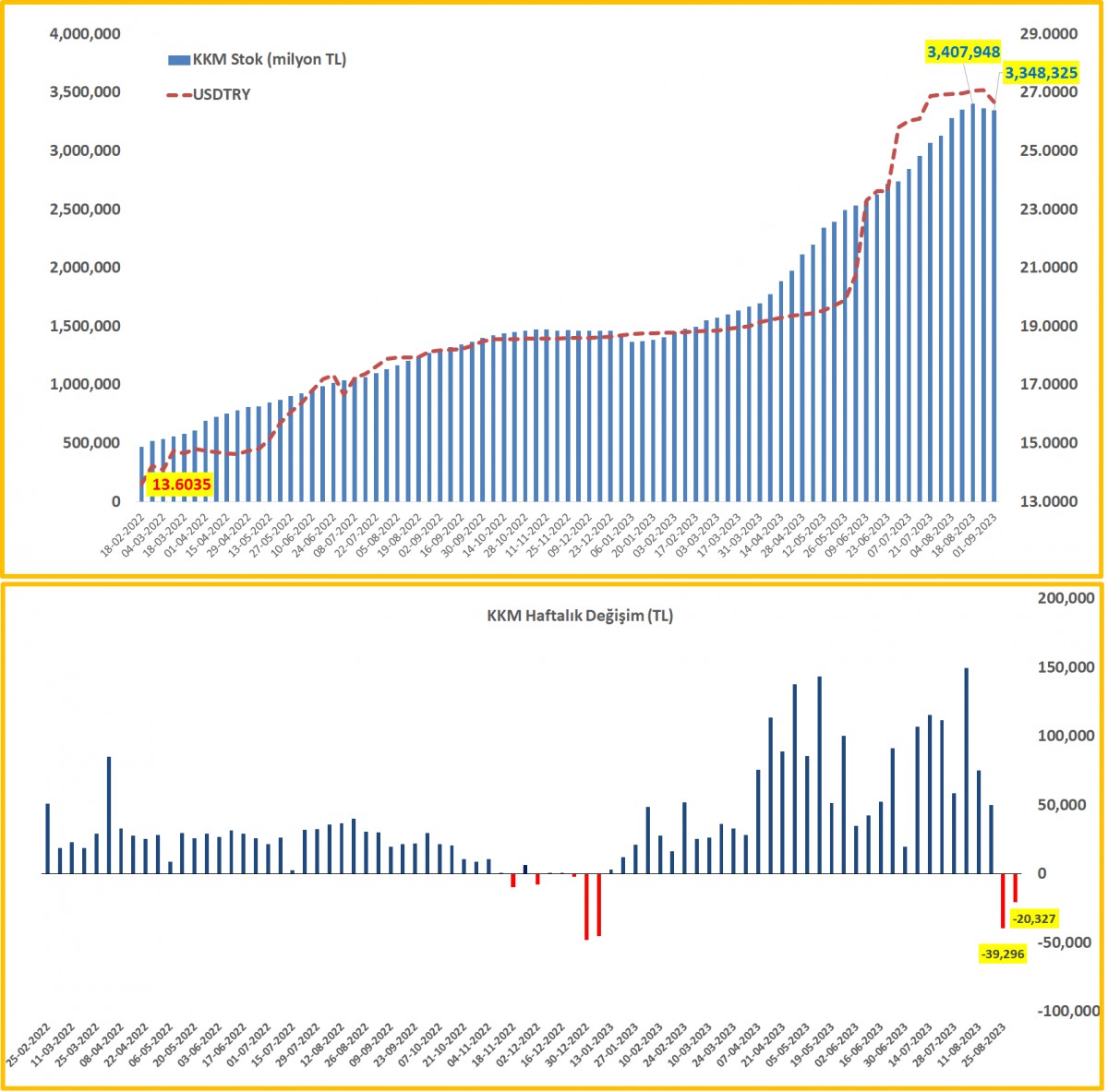KKMBDDK verisine göre KKM hacminde yaklaşık 20 milyar TL'lik bir daralma görüyoruz. Devlet katkısı ile birlikte rakamın daha fazla olduğunu düşünmekte birlikte, azalan KKM bakiyesinin ay sonu ödemeler maksadıyla kullanıldığını düşünüyoruz.