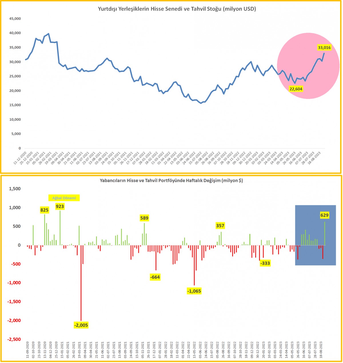 - Piyasaların gözü kulağı ise OVP sonrası 21 Eylül tarihinde TCMB'nin olağan PPK toplantısında olacaktır. OVP'de çizilen yol haritası, Sn. Cumhurbaşkanı Erdoğan'ın faiz konusundaki hassasiyetini terk ederek "sıkı" para politikasına vurgu yapan demeçlerine dün Hazine ve Maliye Bakanı Mehmet Şimşek de katıldı: Sn. Cumhurbaşkanı Erdoğan'ın OVP'ye desteğinin tam olduğunu ve bunu sadece "hissetmediklerini" aynı zamanda "gördüklerini" söyledi. TCMB Başkan Erkan ise "Son dönemde fiyat istikrarı ve finansal istikrar oluşuyor algısının sermaye hareketlerini devreye soktuğunu görüyoruz; bunun devam edeceğini öngörmekteyiz" dedi. Bu noktada yeri gelmişken belirteyim, dün açıklanan TCMB'nin son menkul kıymet istatistiklerine göre, yabancı yatırımcıların tahvil portföyü 375 milyon dolar artış kaydetmiş: en son böyle bir girişi 2021 yılının başında görmüştük! (bakınız grafik).