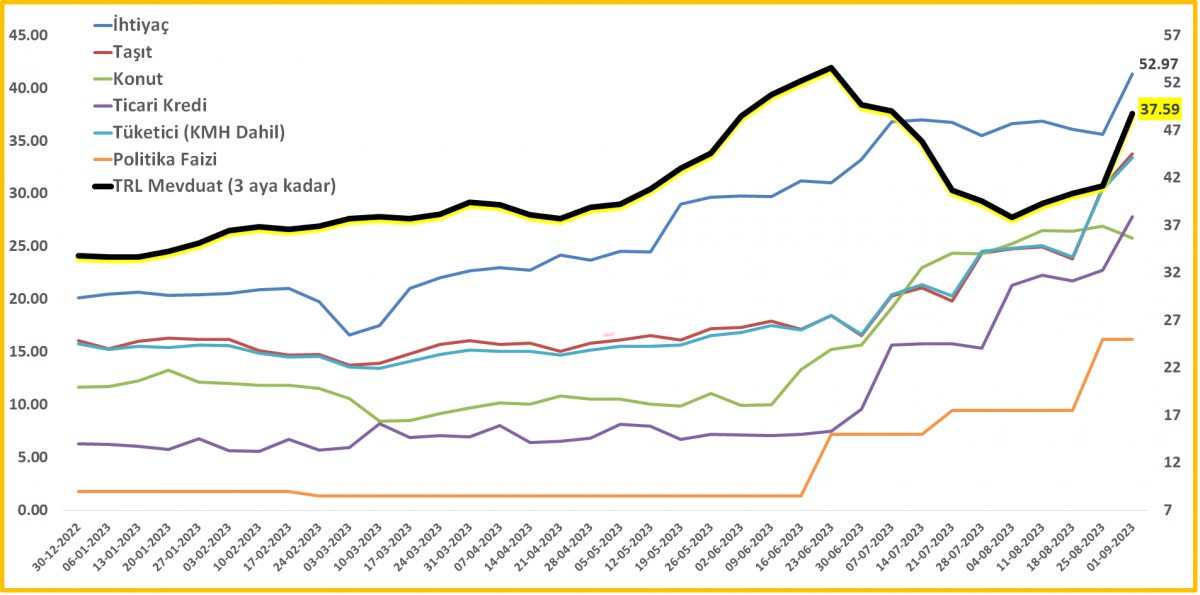 Fiili Faiz OranlarıTüm eğriler (konut hariç) kafasını yukarıya kaldırmış. 3 aya kadar TL mevduat faizi %37,50 ile son 2 ayın zirvesinde geldi.
