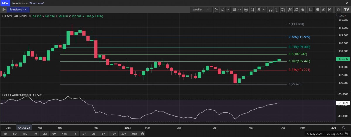 - Dışarıda ise 'limoni' havanın korunmaya devam ettiğini gördük. FED'in bırakın faiz indirimini, geçen hafta sonuçlanan olağan toplantısında 2024 ve 2025 yıllarına yönelik projeksiyonların daha yüksek bir faiz patikasına işaret etmesi, başta Çin olmak üzere Avrupa'yı da tehdit eden durgunluk riski, Japon Yeninin saatli bomba misali değer kaybetmeye devam etmesi, ABD'de ise 10 yıllık gösterge tahvilin son 16 yılın zirvesine yükselmesi topyekûn risk iştahını olumsuz etkiledi. Bu bağlamda, riskten kaçış isteğinin ağır basması ile doların piyasa kuru olan sepet bazında DXY 10 haftadır kesintisiz bir şekilde değer kazanırken, ABD'de milletvekillerinin bütçeyi 30 Eylül'e kadar geçirememesi durumunda başlayacak olan ABD hükümetin kapatılması da ilave riskler arasında yer alıyor.