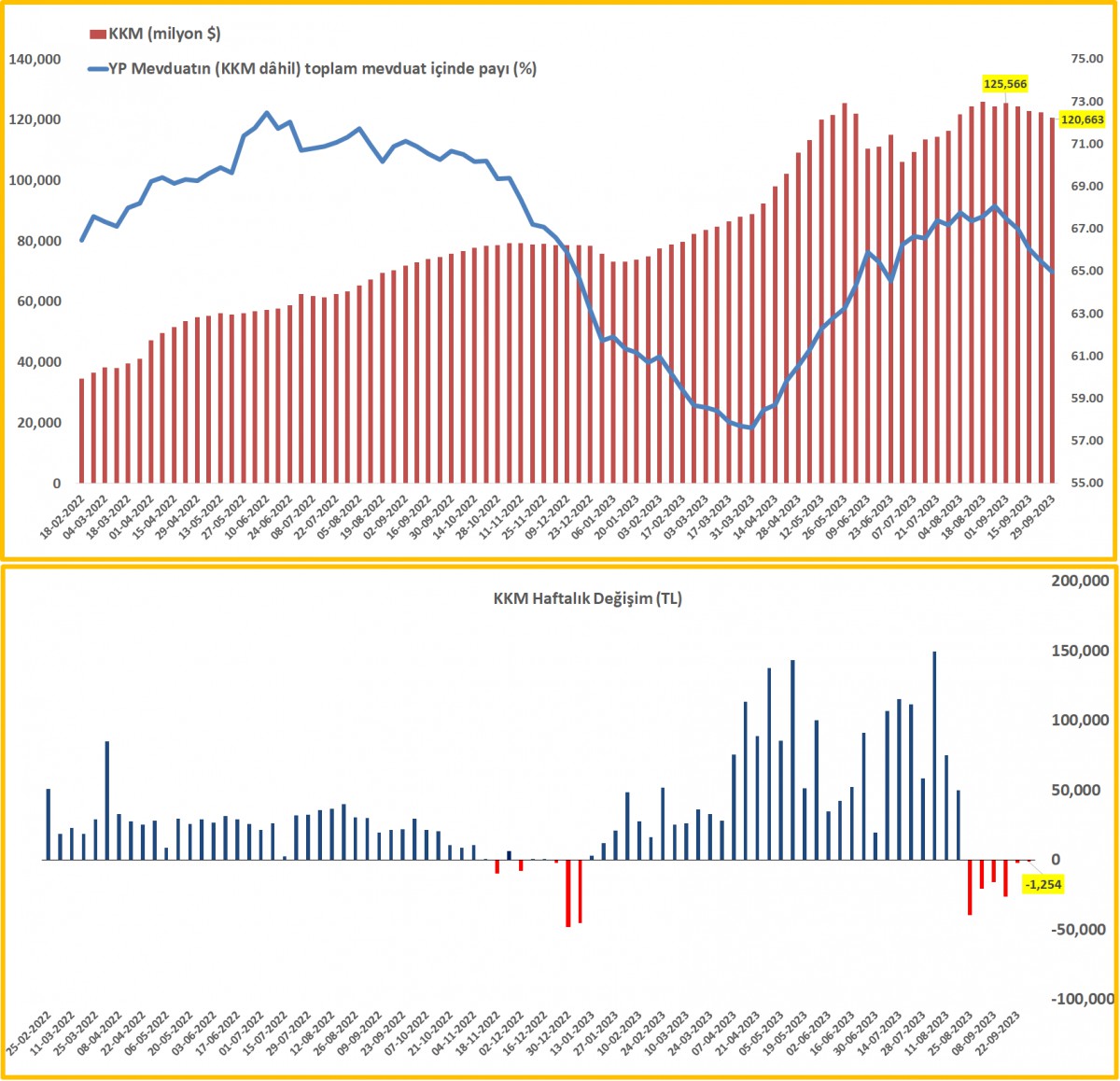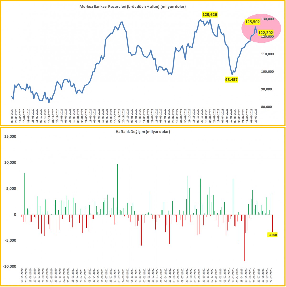 29 Eylül ile biten haftada, TCMB'nin brüt döviz rezervleri 2,2 milyar dolar, altın rezervleri ise 1,1 milyar dolar azaldı. 15 haftadır kesintisiz bir şekilde devam eden yükseliş eğilimi de geçen hafta durmuş oldu.