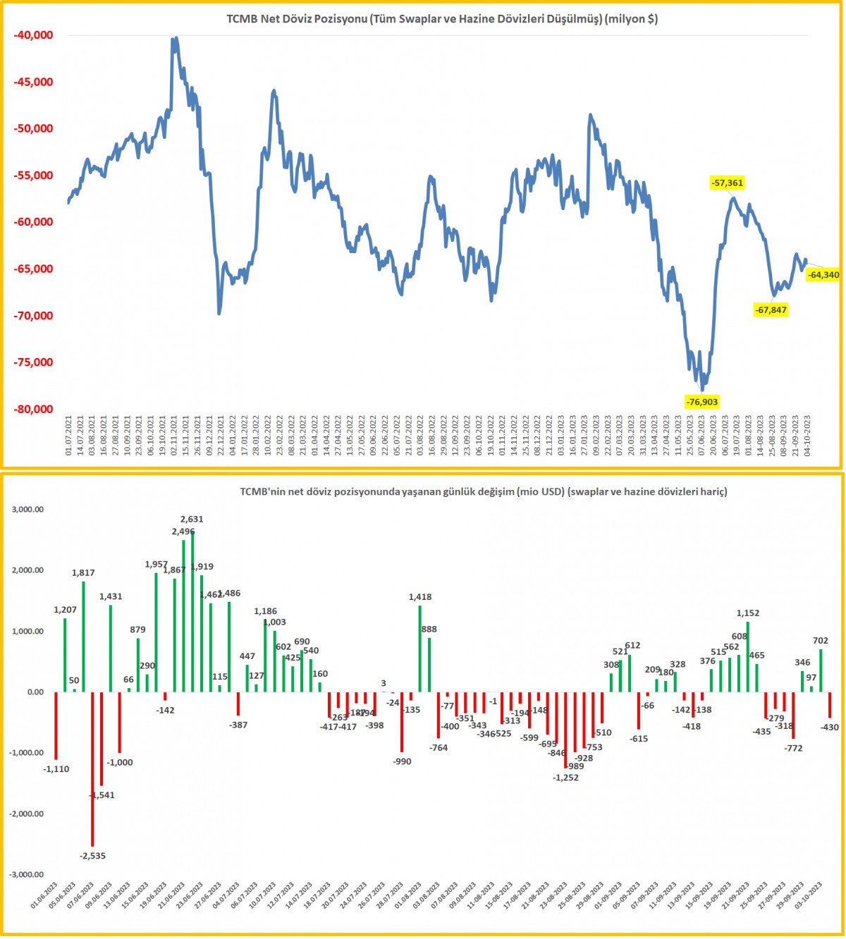 Swap hariç net rezervler29 Eylül ile biten haftada, emanet dövizler (swap) ve kamu dövizleri hariç tutulduğunda, TCMB'nin net rezervleri eksi 64 milyar dolar seviyesinde salınarak bir türlü istenilen toparlanmayı gösteremiyor.