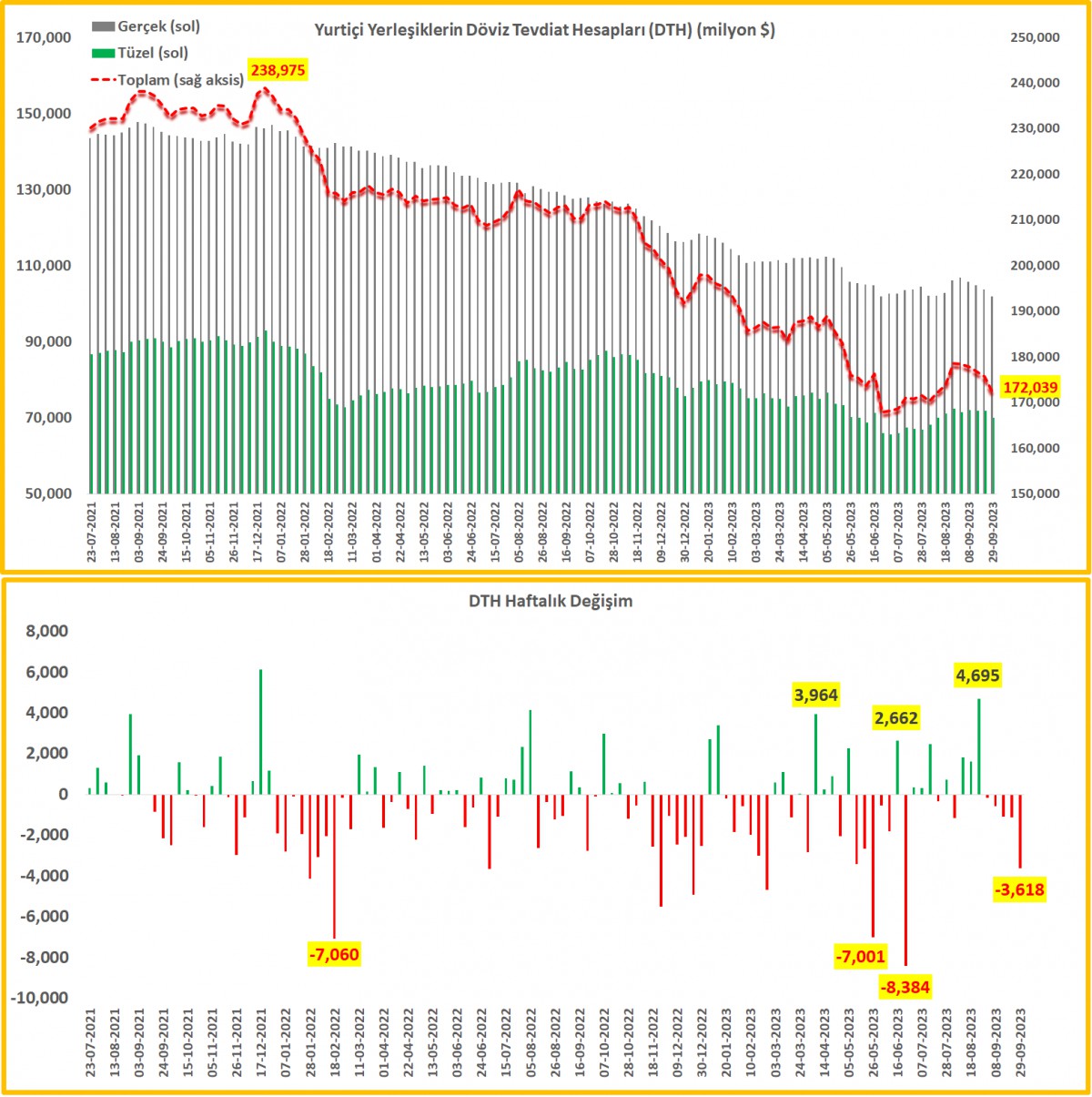 DTH29 Eylül ile biten haftada, yurtiçi yerleşik gerçek kişilerin döviz mevduatları (DTH) 1,8 milyar dolar azalırken, tüzel kişileri de benzer bir şekilde 1,8 milyar dolar azalmış. DTH cephesinde yaşanan 3,6 milyar dolar azalmayı ay sonu etkisine (döviz boz TL ile ödeme yap) bağlıyoruz.