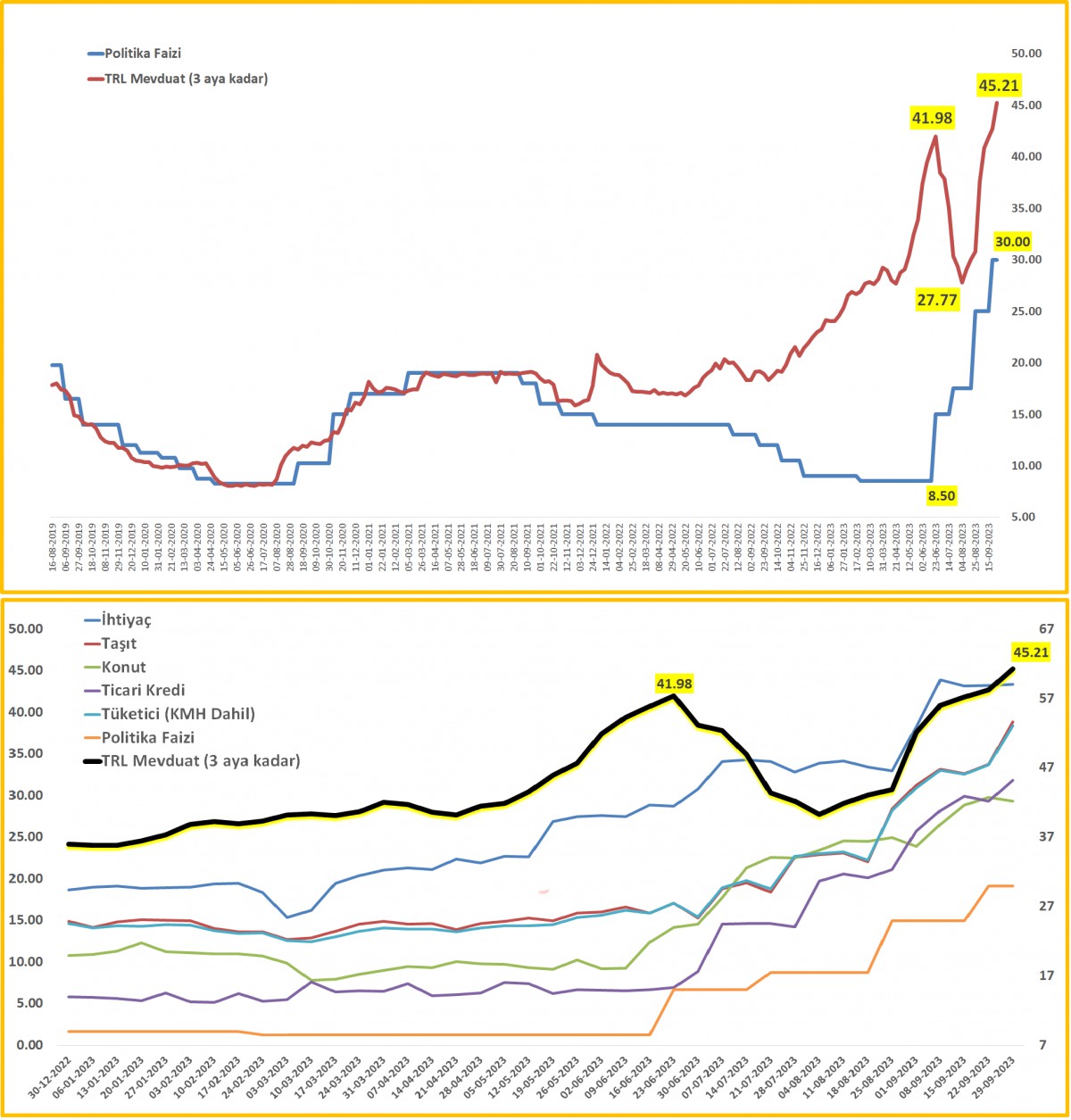 Fiili Faiz Oranları3 ay vadeye kadar TL mevduat faizi 29 Eylül ile biten haftada %45,21 seviyesine yükselmiş.