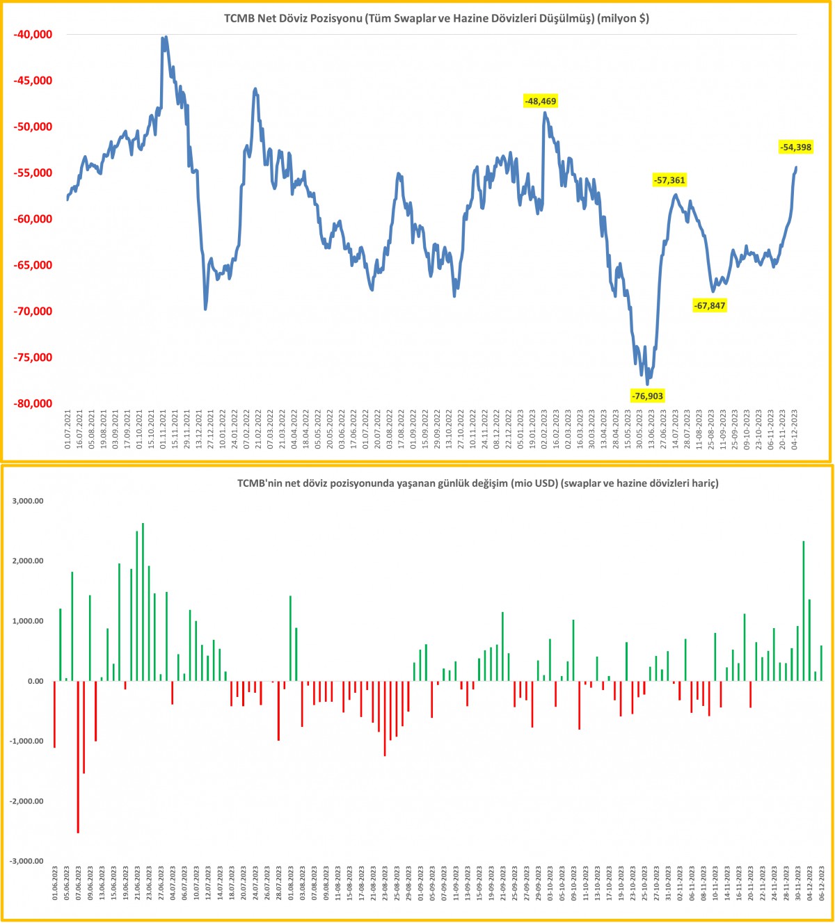 TCMB Net RezervleriTCMB'nin son 12 günde konsolide bazda net döviz pozisyonunda yaşanan günlük değişim 9 milyar dolar artışa işaret ediyor. Seçim sonrası uygulanan aklı selim politikaların bir sonucu olarak TCMB rezervlerinde yaşanan iyileşmeyi büyük bir memnuniyetle karşılıyoruz. Net rezervler (emanat dövizler (swap) ve kamu ve hazine dövizleri hariç) eksi 54,4 milyar dolar seviyesine toparladı.