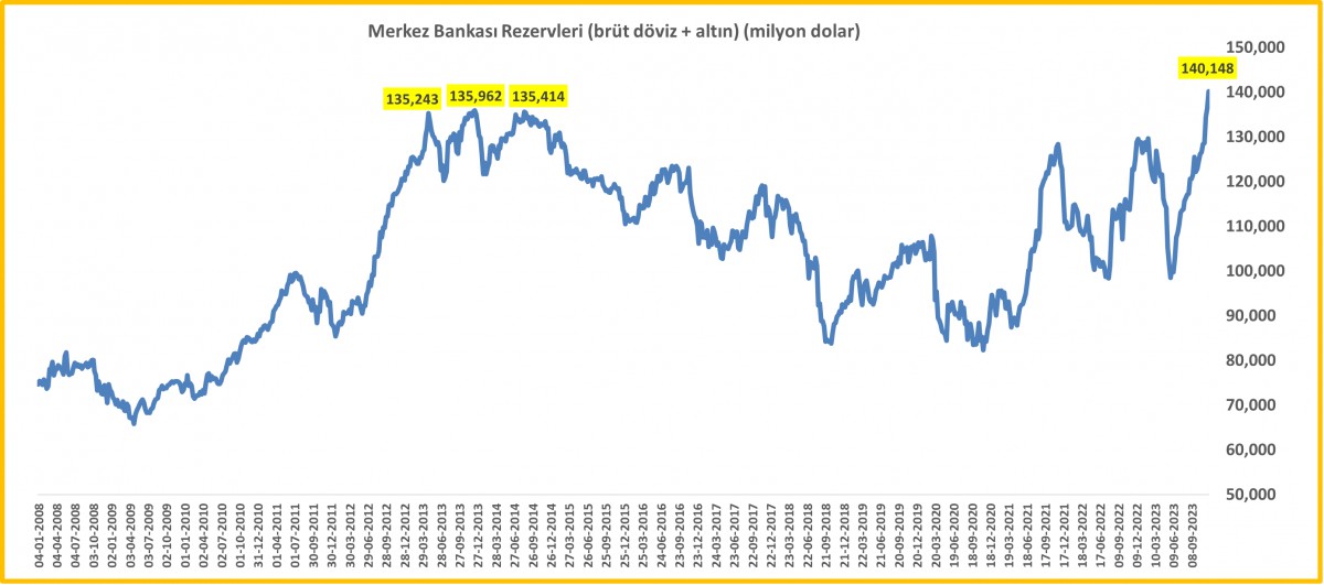 TCMB'nin brüt döviz ve altın rezervleri 1 Aralık ile biten haftada 140 milyar dolar seviyesini aşarak tüm zamanların zirvesine yükseldi.