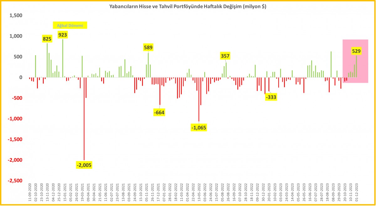 - Rezervlerde yaşanan artış ve beraberinde yabancı yatırımcının da Türkiye ilgisinin artması ile Türk finansal varlıklarının görünümünün de bir adım daha iyileştiğini rahatlıkla söyleyebiliriz. Bu bağlamda, Türkiye'nin yabancı indinde risklerini yansıtan 5 yıl vadeli CDS risk primi 329 baz puan ile son 2,5 yılın en düşük seviyesinde işlem görürken, 10 yıllık gösterge devlet tahvilinin bileşik faizi ise kısa bir sürede %30 seviyesinden neredeyse %25 seviyesine kadar geriledi. Aklı selim olarak nitelendirdiğimiz güven veren politikaların devam etmesi durumunda -rotanın doğru olduğunun da altını kalınca çizersek- 2024 yılına yönelik TL ve TL cinsi varlıklara olan ilginin daha da artmasını bekliyoruz.