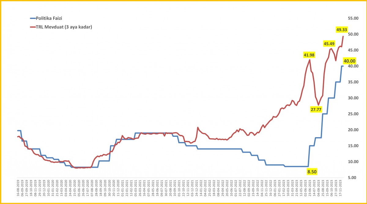 Fiili Faiz Oranı1 Aralık ile biten haftada, 3 aya kadar vadeli TL mevduat faizi %49,33 seviyesine yükselerek 2002 yılında bu yana en yüksek seviyeyi test etti.