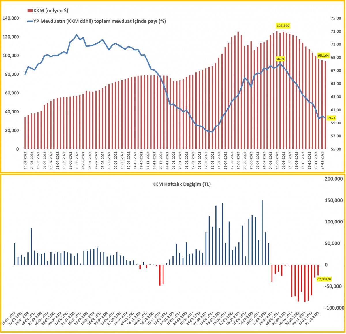 KKMBir nevi yabancı para enstrümanı olan KKM'de azalış istikrarlı bir şekilde devam ediyor. BDDK verisine göre 1 Aralık ile biten haftada KKM hacmi 24 milyar TL daha geriledi. Her ne kadar son dönemde KKM'de erime kesintisiz bir şekilde devam etse de, erime hızının yavaşladığını görüyoruz. KKM'ye uygulanan faizin klasik mevduatın gerisinde olması da KKM'den çıkışı teşvik ediyor.