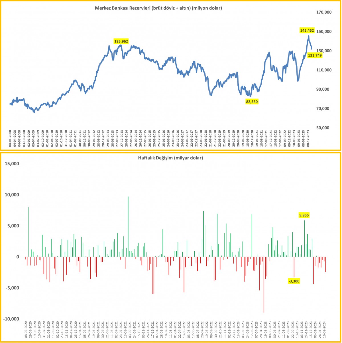 23 Şubat ile biten haftada TCMB'nin brüt döviz ve altın rezervleri 2,5 milyar dolar daha gerileyerek 131,7 milyar dolar seviyesine geldi. Toplam rezervler, Aralık 2023 ayının 3. haftasında 145,5 milyar dolar seviyesine iyileşmişti.