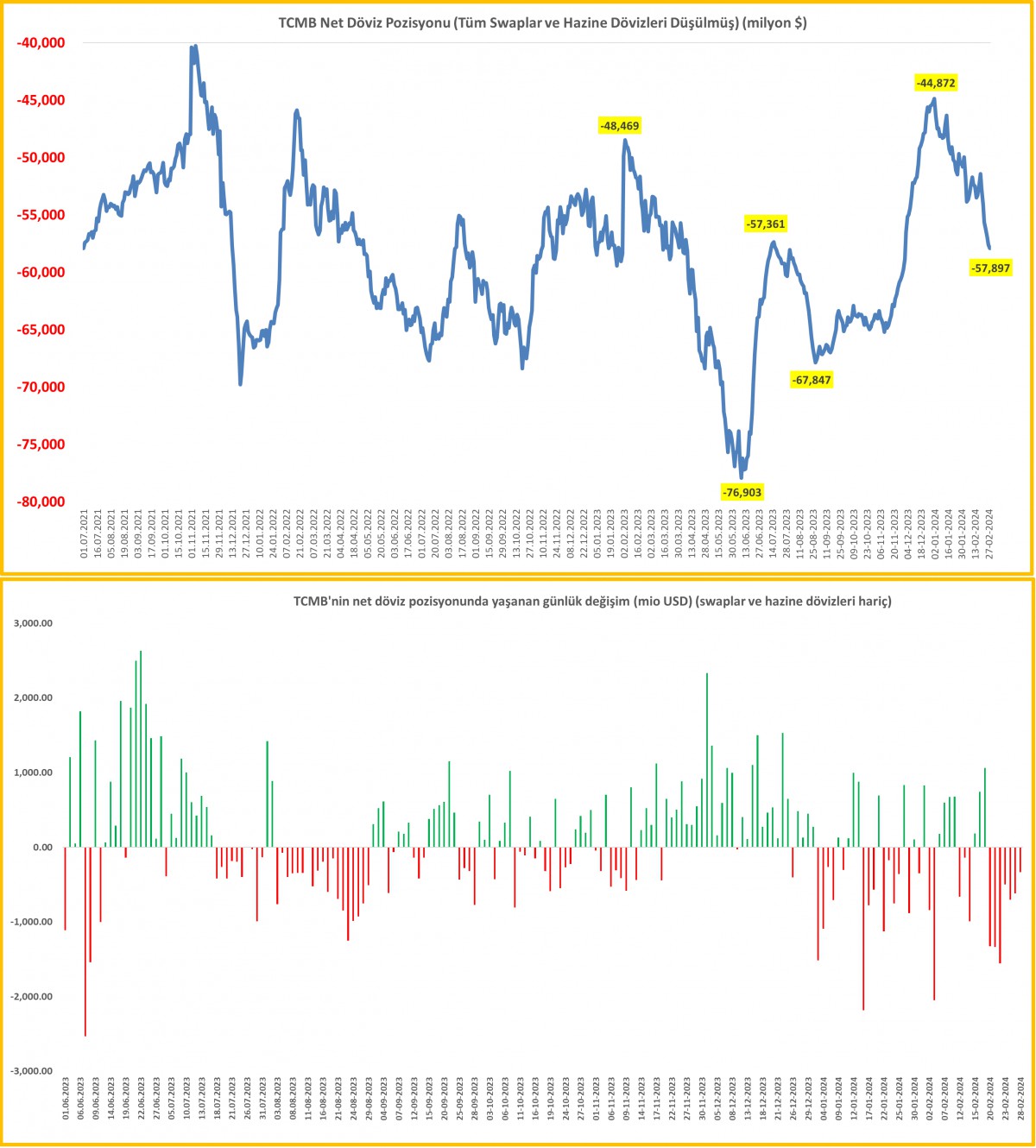 - Her hafta Perşembe günü TCMB ve BDDK'nın açıkladığı haftalık raporları önemle takip ediyoruz. Ne demiştik, ölçemezsen bilemezsin, bilmezsen de yönetemezsin! Bu bağlamda, 23 Şubat ile biten haftada TCMB'nin brüt döviz ve altın rezervleri 2,5 milyar dolar daha gerileyerek 131,7 milyar dolar seviyesine geldi. Toplam rezervler, Aralık 2023 ayının 3. haftasında 145,5 milyar dolar seviyesine iyileşmişti. Öte yandan, emanet dövizler (swap) ve kamu mevduatını da dışarı bırakırsak, TCMB'nin net döviz pozisyonundaki erime 2024 yılında 13,1 milyar dolar oldu. Bu rakamın da neredeyse yarısının son 7 günde olması dikkat çekici!