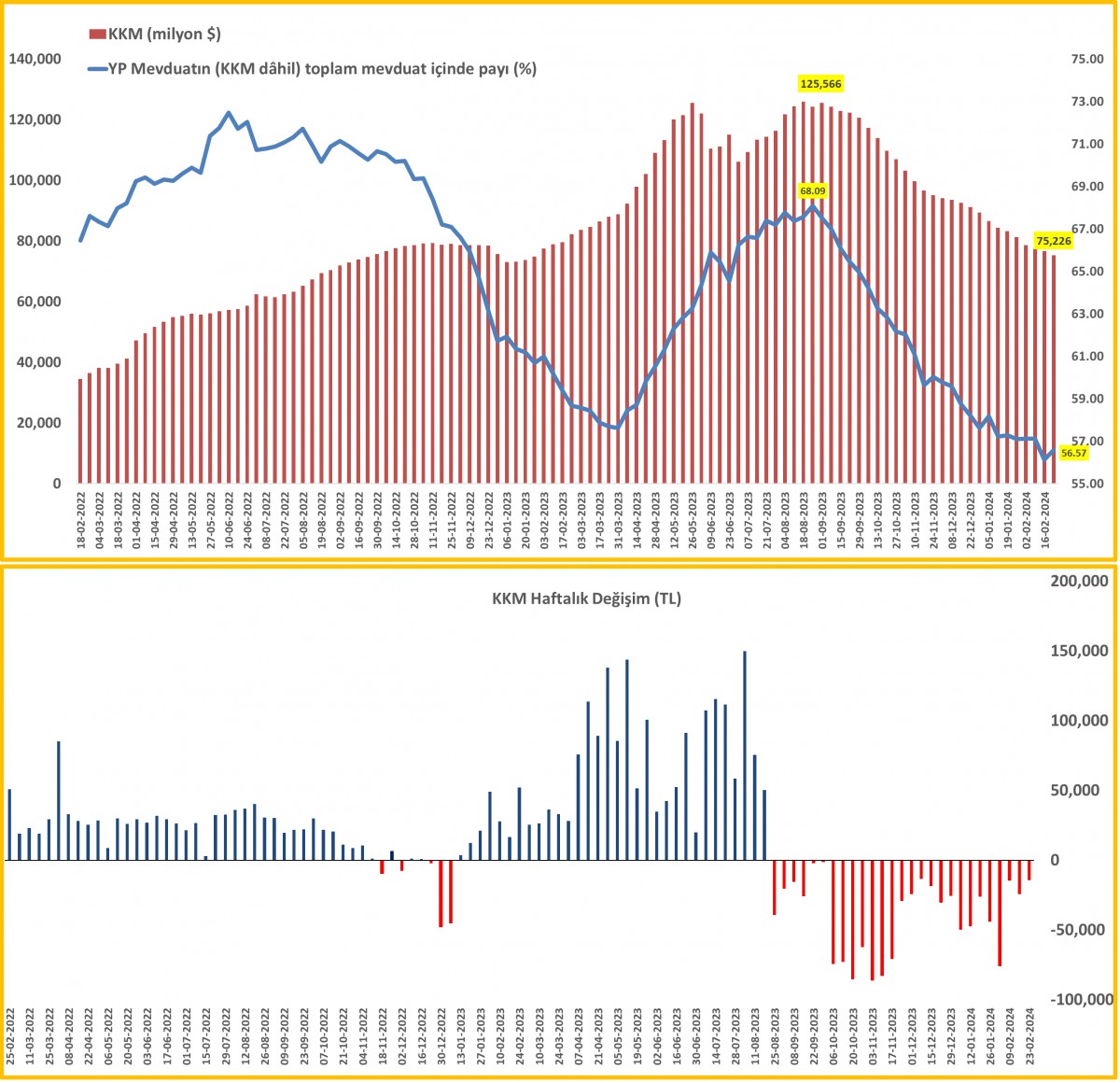 KKM23 Şubat ile biten haftada, BDDK verilerine göre KKM hacminde haftalık bazda 19,3 milyar TL düşüş yaşandı. Toplam stok miktarı 75,2 milyar dolar.