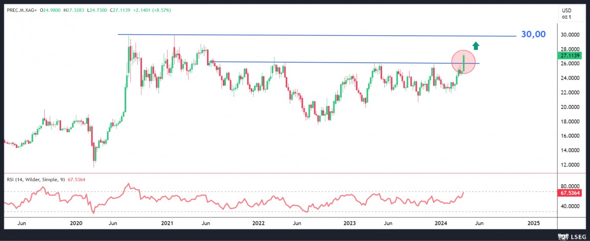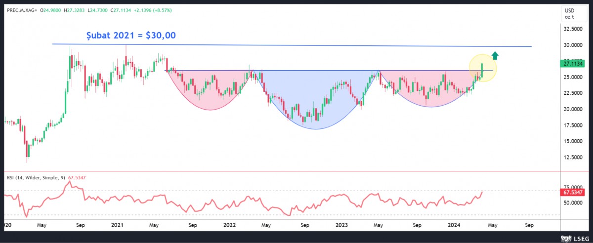 Son dönemde yaşanan iyimserlikte biraz geride kalan gümüş cephesinde 26,20 dolar seviyesinin yukarı yönlü geçilmesi ile uzun pozisyon açtık. İlk etapta tüm zamanların zirvesi olan 30 doları ve akabinde devamının da gelmesini bekliyoruz.
