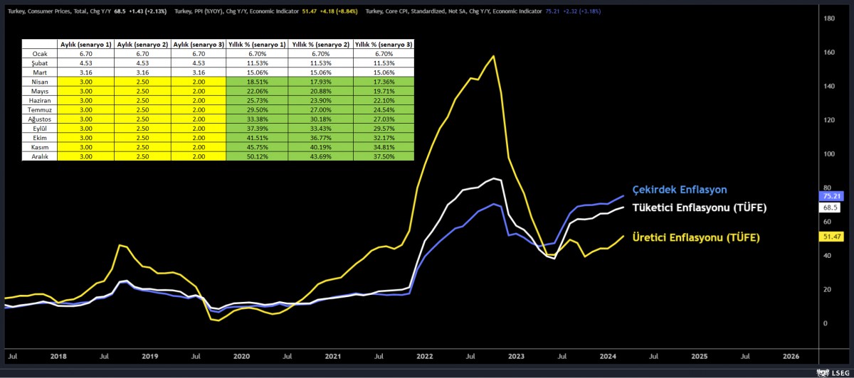 - Verinin alt detaylarında, özel kapsamlı TÜFE göstergelerinden B yıllık %71,89 (12 aylık ortalama %62,61), C ise %75,21 artış kaydederek enflasyon eğiliminin hâlen daha çok yüksek olduğunu teyit etti. Ana gruplar itibariyle, en yüksek aylık artış %13,08 ile eğitim grubunda olurken, bir önceki yılın aynı ayına göre artışın en yüksek olduğu ana grup yine %104,07 ile eğitim oldu. Mart'ta gıda fiyatlarındaki aylık artış %3,4 ; giyim ve ayakkabı grubunda ise %2,64 olarak gerçekleşti. Yurtiçi ÜFE ise Mart ayında %3,29 artarken, yıllık artış %51,47 oldu (Şubat %47.29). Hazine ve Maliye Bakanı Mehmet Şimşek verinin ardından yaptığı paylaşımda "Birincil önceliğimiz olan fiyat istikrarı hedefimize ulaşana kadar ne gerekiyorsa yapacağız" diyerek mevcut politikaların devamına işaret etti.