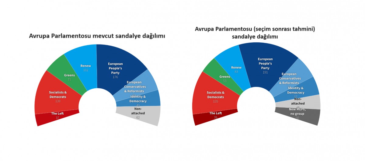Avrupa Birliği üyesi 27 ülkede, 720 sandalyeli Avrupa Parlamentosu için 6-9 Haziran tarihleri arasında seçimler düzenlendi. Sandık çıkış anketlerine göre, Avrupa'da aşırı sağın yükselişi en dikkat çekici unsur olarak ön plana çıktı. Aşağıdaki grafikten de görüleceği üzere, ilk sonuçlara göre, merkez-sağdaki Avrupa Halk Partisi’nin (EPP) en büyük grup olarak kalması, merkez-soldaki Sosyalistler ve Demokratlar İlerici İttifakı’nın (S&D) ise ikinciliği koruması bekleniyor. Ancak aşırı sağdaki iki grup olan Avrupalı Muhafazakarlar ve Reformistler (ECR) ile Kimlik ve Demokrasi’nin (ID) güç kazanacağı görülüyor. Bunlara ek olarak, bugün herhangi bir gruba dâhil olmayan radikal sağ partilerin de parlamentoda temsilinin artması öngörülüyor.