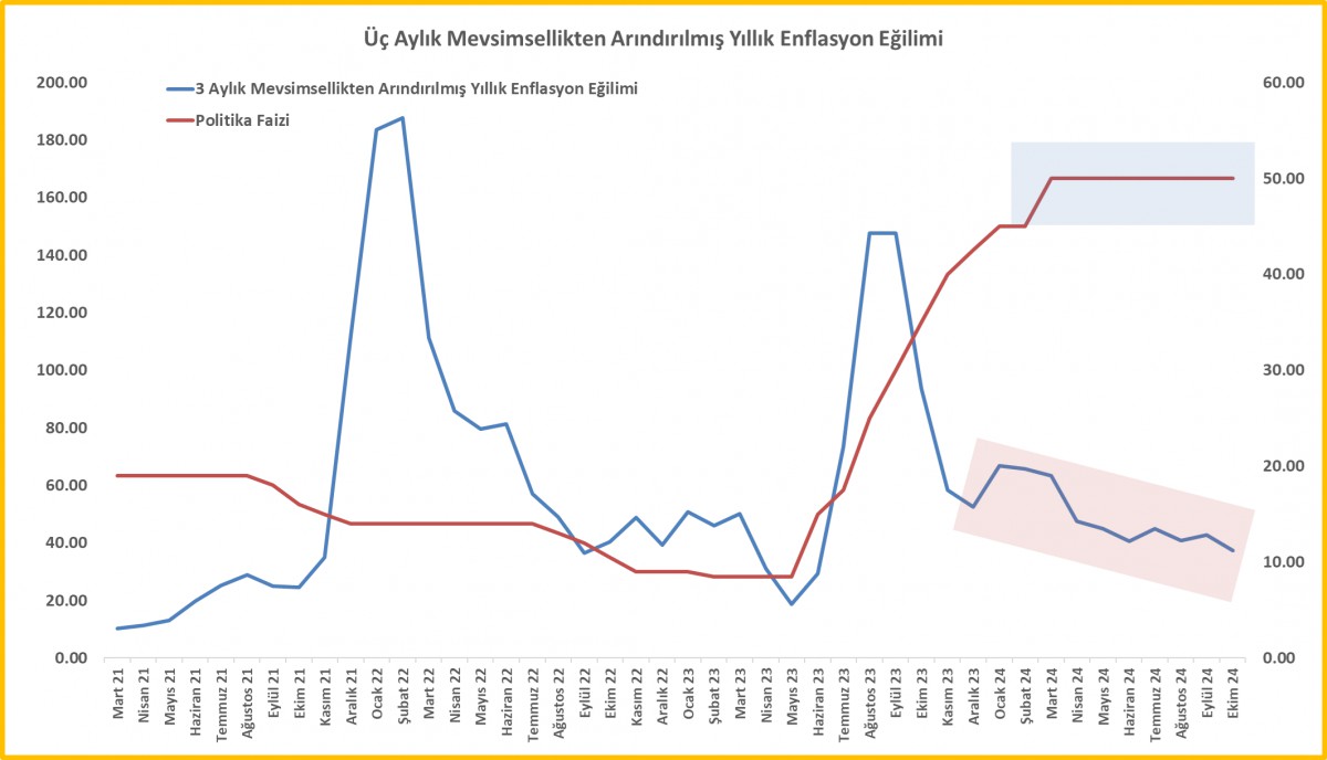 - Bizler de, uzun bir süredir, sadece yükü TCMB'nin omuzlarına bırakarak 'canavarı' yenmenin pek de kolay olmayacağını kaleme alıyoruz. Dün, enflasyon verisi ardından mevsimsellikten arındırılmış TÜFE verilerini inceledik. Bu bağlamda son üç ayının yıllıklandırılmış seyrine bakarak (yayılma endeksi) Ekim ayında enflasyonun %37,3 seviyesine hafif de olsa gerilediğini gördük. Her ne kadar düşüş çok sert olmasa da, Aralık ayında da gerileme görülmesi durumunda, TCMB'nin faiz indirim kartını çekmesinin çok uzak bir ihtimâl olmadığını düşünmeye başladık (bakınız grafik).