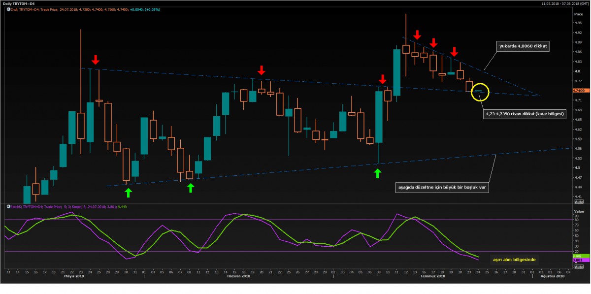 Karar bölgesi sarı daire ile kabaca 4.73 seviyelerinde olacağını düşünüyoruz. TCMB’nin vereceği karara göre piyasanın yönü belli olacaktır. 125 baz puan artırım (piyasanın bir tık önüne geçmesi) aşağıda 4.50’li seviyelerin önünü açabilir. Beklenti karşılanmazsa, yukarda 4.8060 seviyesine dikkat edelim.