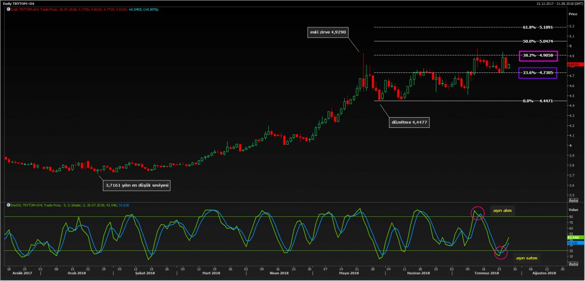Papaz Brunson’un yarattığı iyimserlik ve akabinde Trump-Junker görüşmesinin yarattığı iyimserlik ile 4.77 seviyelerini gece geç saatlerde test eden USD/TL kuru, sabah saatlerinde yeniden 4.82 seviyelerine yükseldi. Teknik manada 4.9050 seviyesinin üzerinde gecelik kapanış görmeden kurun 4.7350-4.9050 arasında yön aramaya devam edeceğini düşünüyoruz. 4.7350 altı veya 4.9050 üzerinde gecelik kapanış, geçildiği yöne doğru hareketin ivme kazanmasına neden olacaktır.
