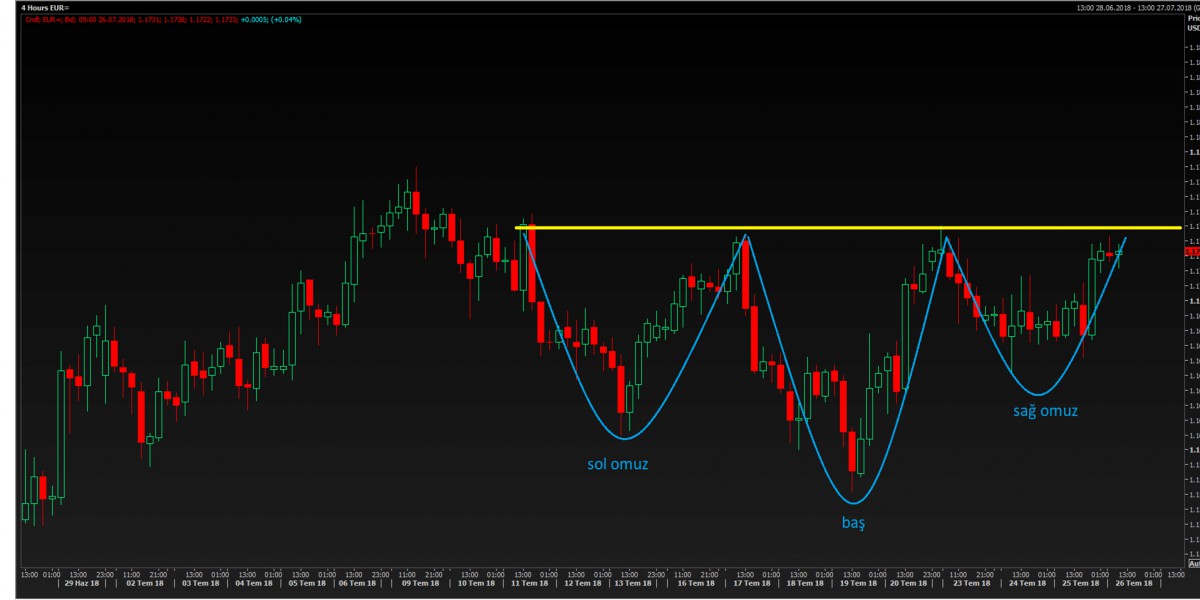 TOBO (ters omuz baş omuz formasyonu) dikkat çekiyor. Yükseliş sinyali olarak görülmelidir. Kritik seviye sarı çizgi olan (boyun çizgisi) 1.1750 olarak görülmelidir. Üzerine atabilirse, anlamlı bir yükselişin başlangıcı olabilir. Avrupa Merkez Bankası kararı ardından EUR/USD'de hareketin ivme kazanmasını bekliyoruz.