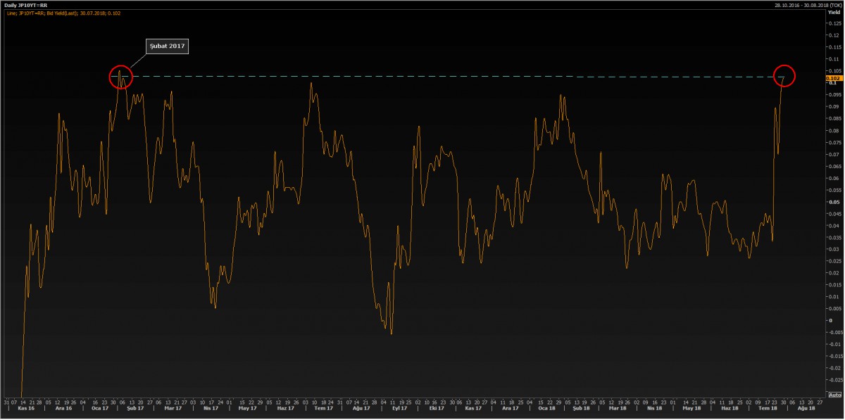 Aşağıdaki grafikten de görülebileceği üzere, 2016 yılının ikinci yarısında itibaren uyguladığı para politika ile uzun vadeli tahvilleri %0 civarında tutmayı başaran Japonya Merkez Bankasının (BOJ), bu politikasını sona erdirebileceğine veya sınırlayabileceğine dair son günlerde artan dedikodular, piyasaların dikkatinden kaçmamış. Yarın düzenlenecek olağan toplantıda, piyasa dedikodusunun karşılık bulması ve tahvil alımlarının azaltılması durumunda, global faiz oranlarında yükseliş, likiditede yaşanacak daralama nedeniyle (bol para döneminin azalması) dolarda değerlenme görülebileceğini düşünüyoruz. Bu sabah itibarı ile 10 yıllık Japon tahvilinin bileşik faizi %0.103 seviyesine yükselerek Şubat 2017’den bu yana en yüksek seviyeye ulaştı.