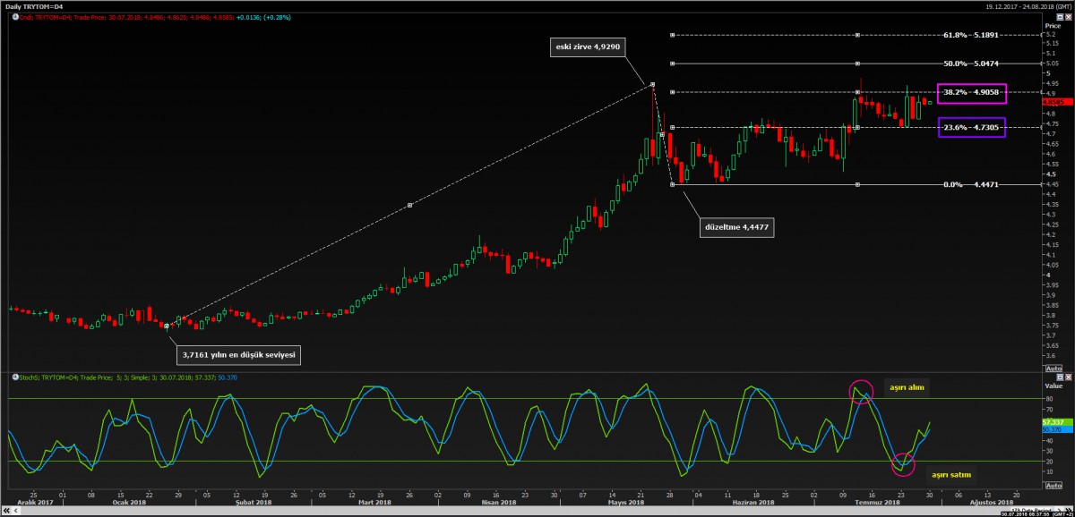 2018 yılının en düşük seviyesi olan 3.7161’den başlayan, ilk zirve olan 4.9290 biten ve akabinde 4.4477’ye kadar düzeltmesini yaparak tekrar yol alan USD/TL kuru, yukarda 4.9050 aşağıda da 4.73 aralığında sıkıştı. Kurun bu seviyeler arasındaki seyrini gri alan olarak görüyoruz. Geçildiği yöne doğru hareketin ivme kazanmasını bekliyoruz.