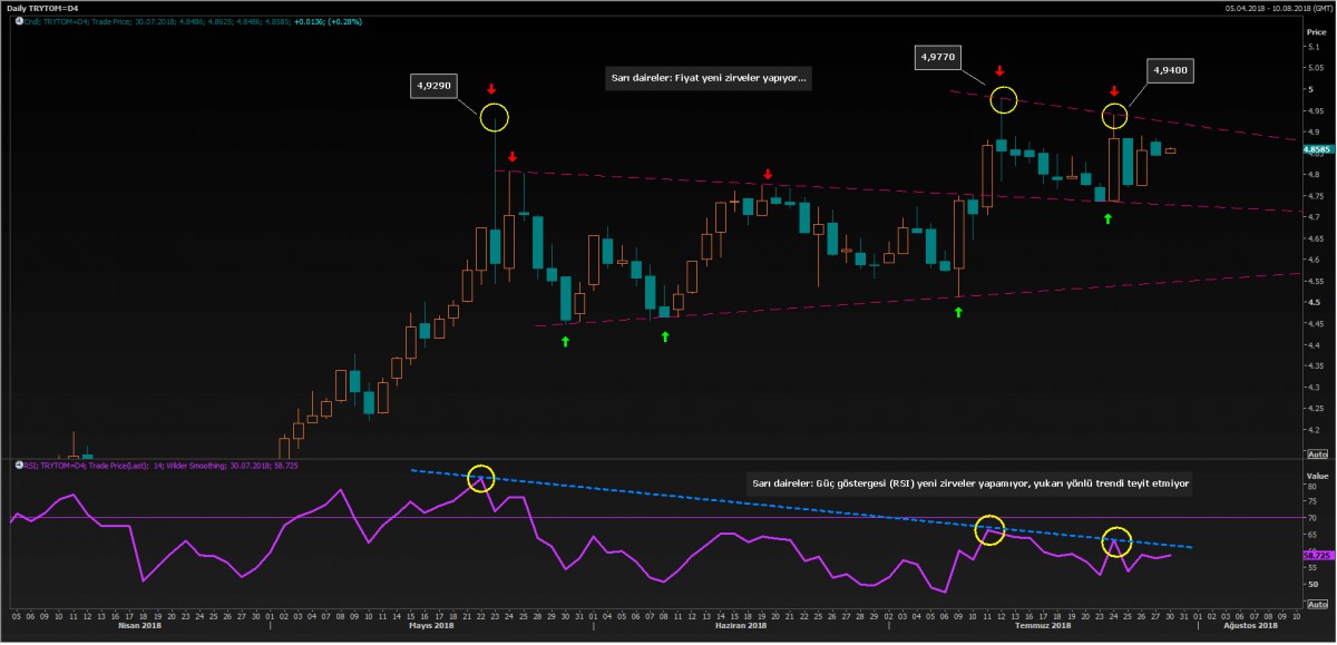 USD/TL kuruna bir başka gözle bakarsak grafiğin üst kısmında fiyat, alt kısmında ise güç göstergesi RSI bulunuyor. Üst kısımda, son 3 majör yükseliş hareketini sarı dairelere aldım. Grafiğin aşağısında ise güç göstergesi RSI (aşırı alım satım indikatörü) fiyatın ne kadar güçlü olup olmadığına ışık tutuyor. Majör fiyat yükselişlerinin karşılığına baktığımızda, yükseliş hareketlerinin tam anlamıyla karşılık bulmadığını görüyoruz. Fiyat yukarı gitmeye çalışırken, RSI aşağı yönlü bir eğilim sergiliyor. USD/TL kuruna teknik cepheden yaklaşırsak, kurdaki yükselişin belki de sanıldığı kadar güçlü olmadığını, her sıçrayışın daha da yukarı gidecek kadar altının dolu olmayabileceğini düşünüyoruz.