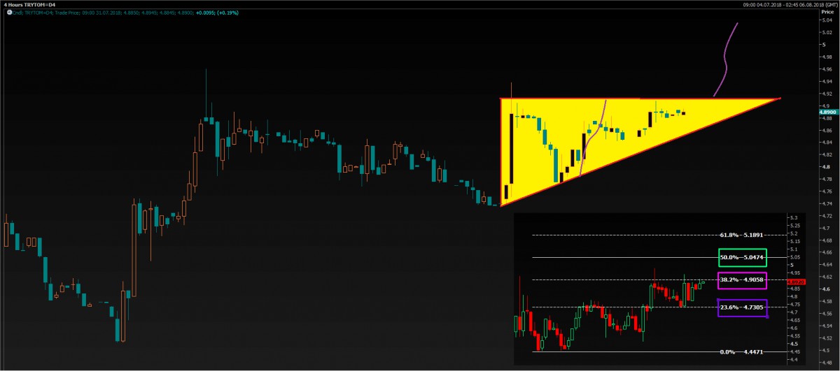 USD/TRY cephesinde haber akışının tetiklediği negatif hava kur üzerinde baskı kuruyor. Dün itibarı ile ters üçgenin üst bandın test eden USD/TRY kurunda, ters üçgenin yukardan geçilmesi durumunda (4.9050 üzerinde gecelik kapanış veya 4.92 / 4.94 bandının aşılması.) kur üzerinde “patlayıcı” bir etki yaparak teknik manada 5.04 seviyesinin önünü aşabilir. Öte yandan olumlu bir haber akışı ile üçgenin alttan kırılması, kurda yeniden 4.73 seviyelerinin kilidini açabilir.