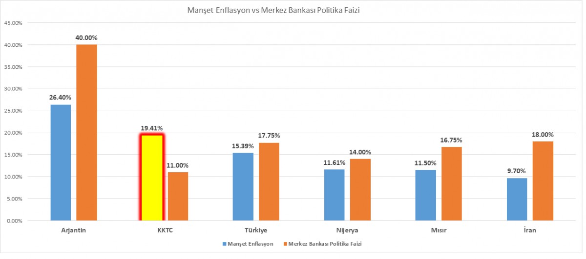 Grafikleri çirkinleştirmemesi adında yıllık % 24,571 enflasyona sahip (politika faizi % 20,99) olan Venezuela’yı dışarda bırakırsak, KKTC, Arjantin ardından dünyanın en yüksek 3. enflasyona sahip ülkesi konumunda. Ülkelerin enflasyon oranı ve Merkez Bankalarının uyguladığı faiz oranlarına baktığımızda, politika faizinin enflasyonun altında kalan tek ülkenin yine KKTC olduğunu görüyoruz.