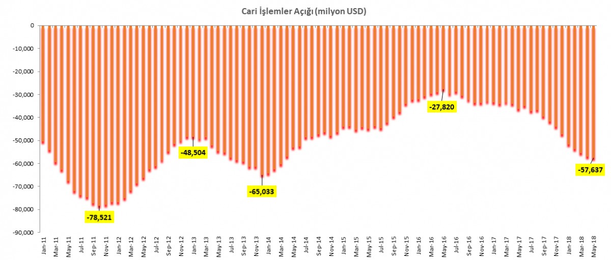 TCMB, Mayıs ayı ödemeler dengesi istatistiklerini açıkladı. Buna göre, cari işlemler dengesi, Mayıs ayında tahminlerin üzerinde 5,9 milyar dolar açık verdi. Bu sonuçla, 12 aylık kümülatif cari işlemler açığı 57,6 milyar dolara ulaştı. Bu rakam son 5 yılın en yüksek rakamı ve ayrıca da GSYIH’ye oranı % 6,5 seviyesini aştı. Cari işlemler açığındaki artış ne yazık ki büyük kırılganlık yaratıyor ve uzun vadede de kur üzerinde yukarı yönlü baskı oluşturuyor.