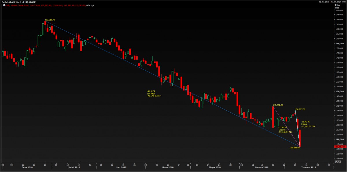 Borsa İstanbul’un itici lokomotifi olan bankacılık endeksi (XBANK) son 2 günde adeta çöktü. Grafiğin biraz gerisine gidersek, Ocak sonuna nazaran XBANK % 40,5 değer kaybettiği, son 12 güne nazaran % 17,90 düştü, son 3 günde ise % 16,40 gerilediğini görüyoruz. Türkiye cephesinde şu anda gerek tahvil gerekse de hisse senedi piyasalarında yeniden bir fiyatlama davranışının hakim olduğunu rahatlıkla söyleyebilirim.