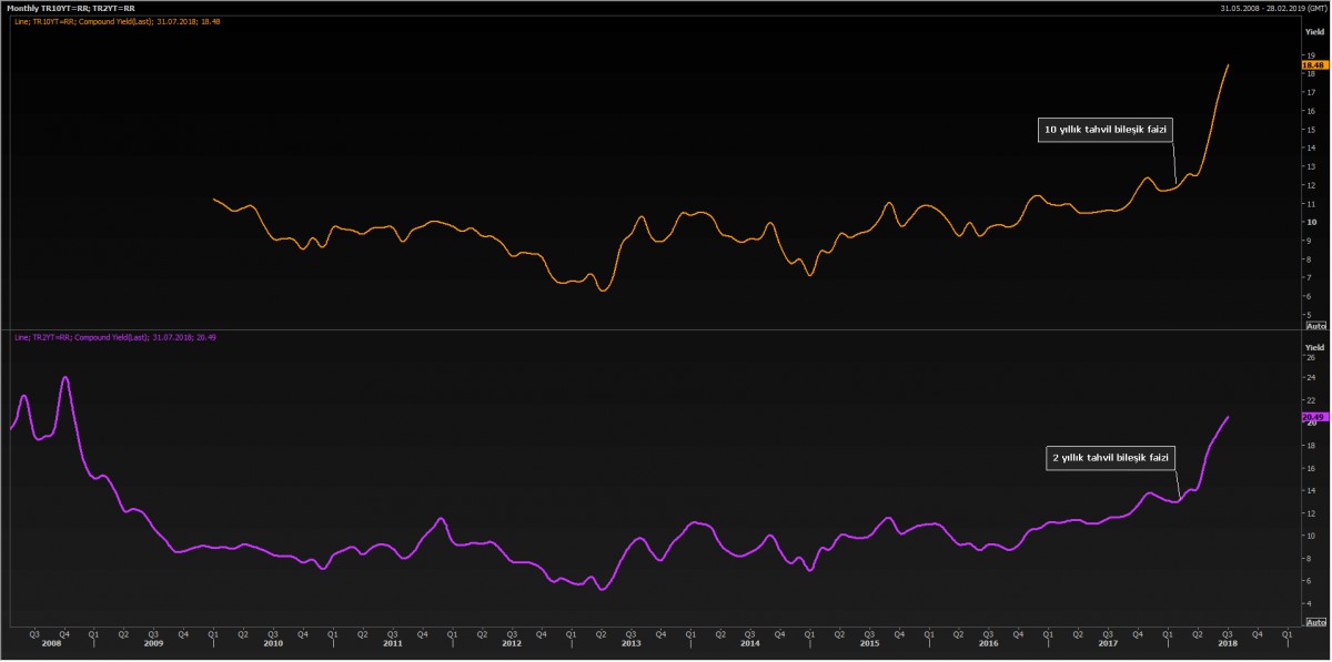 2 yıl vadeli tahvilin bileşik faizi 2008 seviyelerine dönerken, 10 yıl vadeli tahvilin bileşik faizi ise rekor kırdı. Faizin bir günde yaklaşık 1 tam puan yükseldiğini görüyoruz.