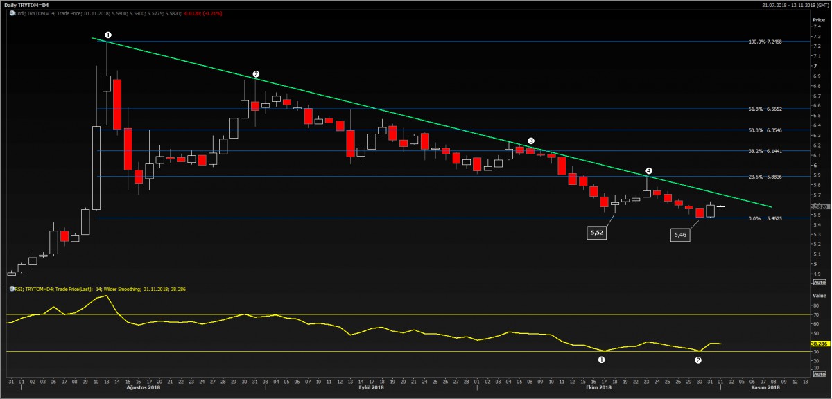 Dün de bültenimizde belirttiğimiz üzere, USD/TL kuru 5.52 ve 5.46 ile son günlerde iki tane dip yaparken, güç göstergesi RSI ise yeni bir dip gerçekleştiremedi (sarı çizgi 1 ve 2 numara). Teknik analizde buna uyumsuzluk denir ve fiyatın aşağıya gitmekte zorlandığını gösterir.