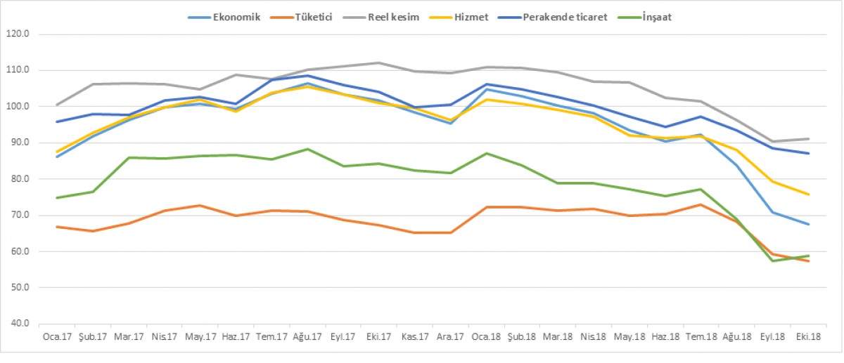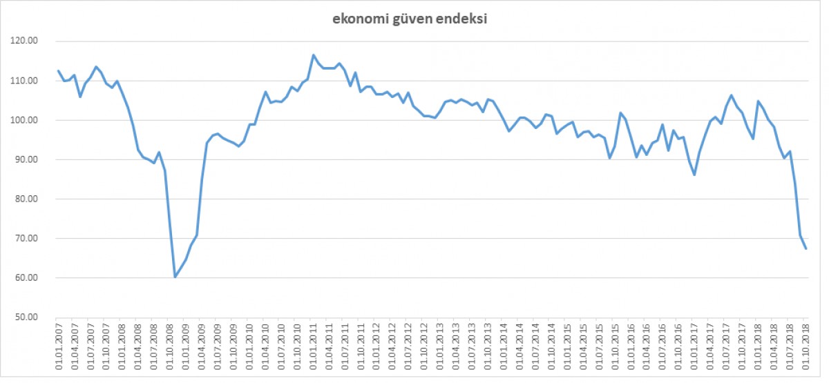 TÜİK tarafından açıklanan ekim ayı ekonomik güven endeksi 67.5 ile bir önceki aya göre 3.5 puan, geçen yılın aynı dönemine göre ise 34.3 puan düştü.